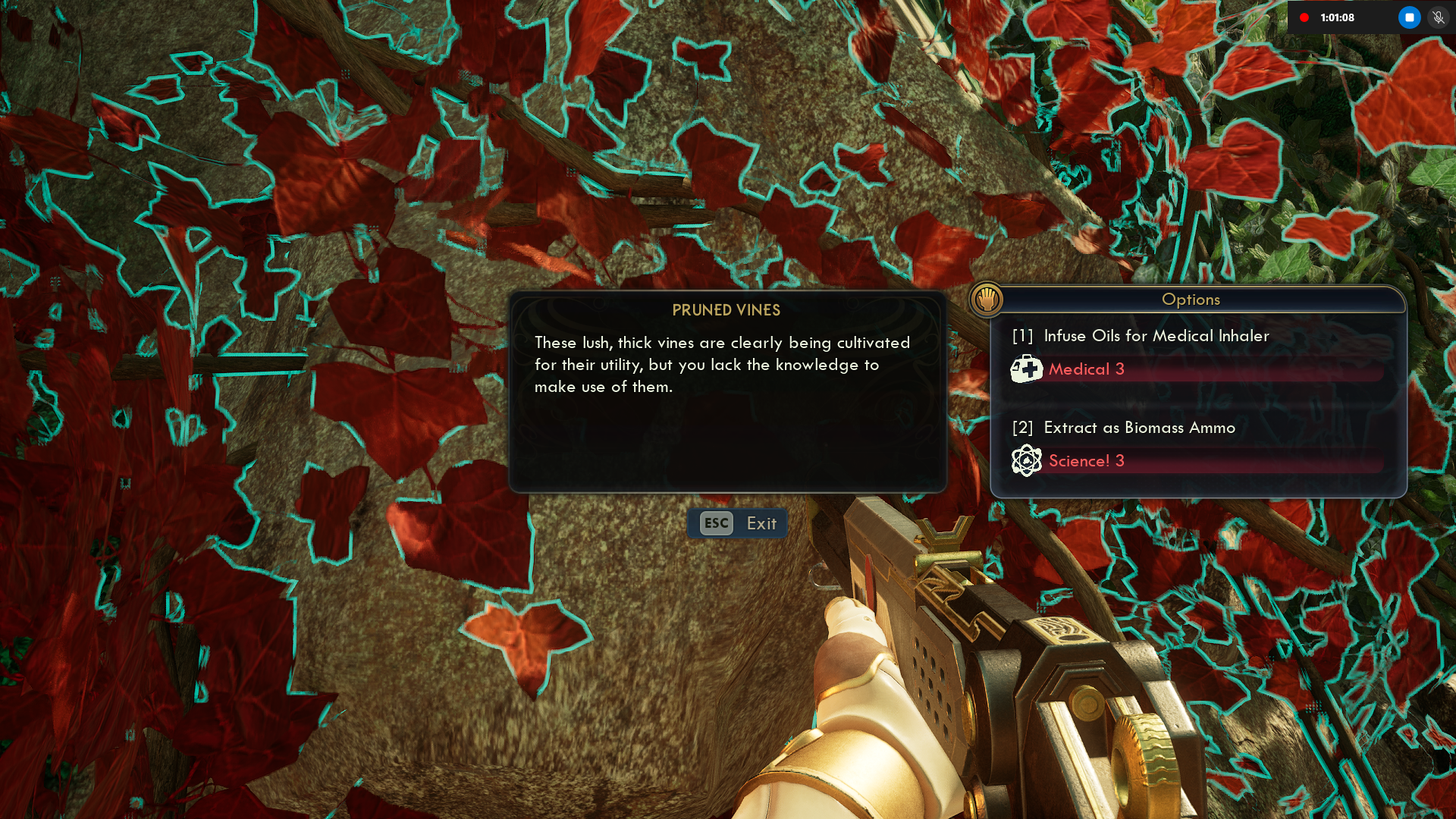 Before you reach the Drive Overloader, you’ll see red, vine-like plants growing on the mountain. With a Medical skill of 3, you can gather these to upgrade your Medical Inhaler. Alternatively, if your Science! skill is 3 or higher, you can use them as Biomass ammunition.