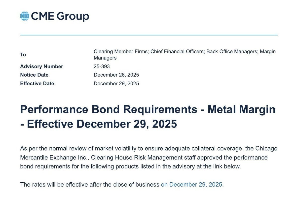 Enter the CME-cue dramatic music. As silver futures soared higher than a kite caught in a gale, the exchange announced another round in its war against volatility: ramping up margin requirements. Front-month margin requirements went from $22,000 to $25,000 per contract, roughly a 13.7% increase, effective right after Santa had gone back to the North Pole. 🌨️