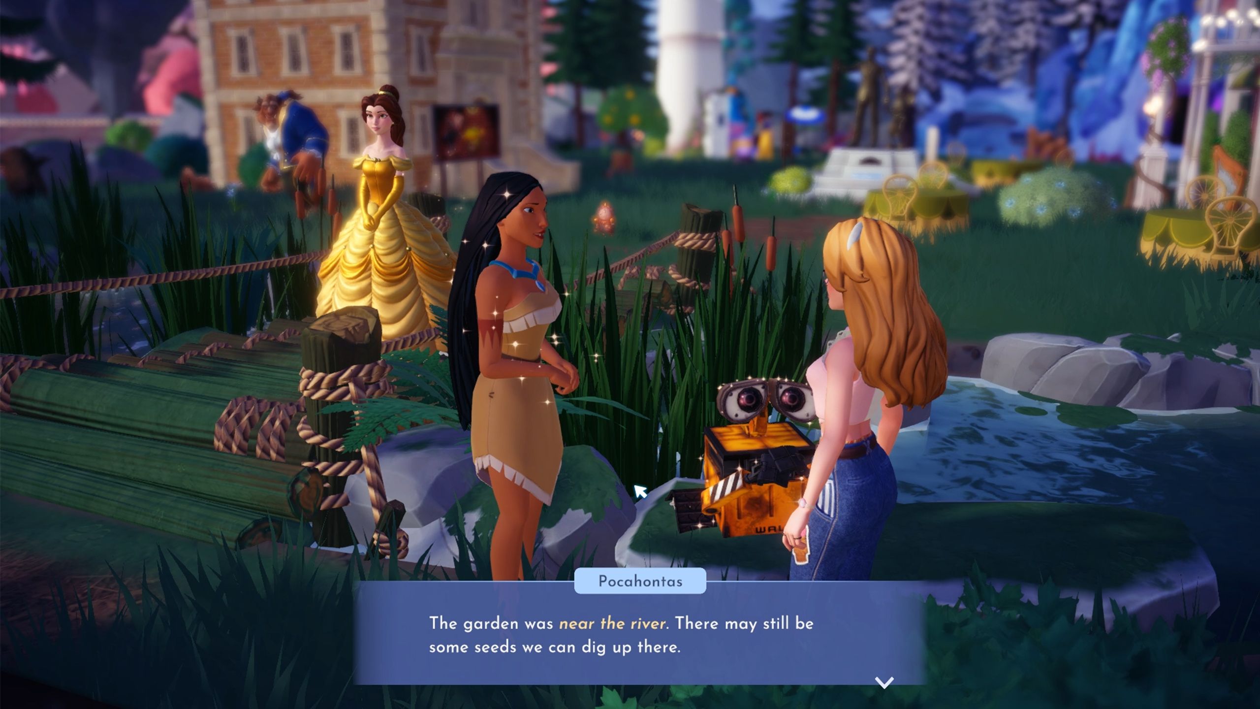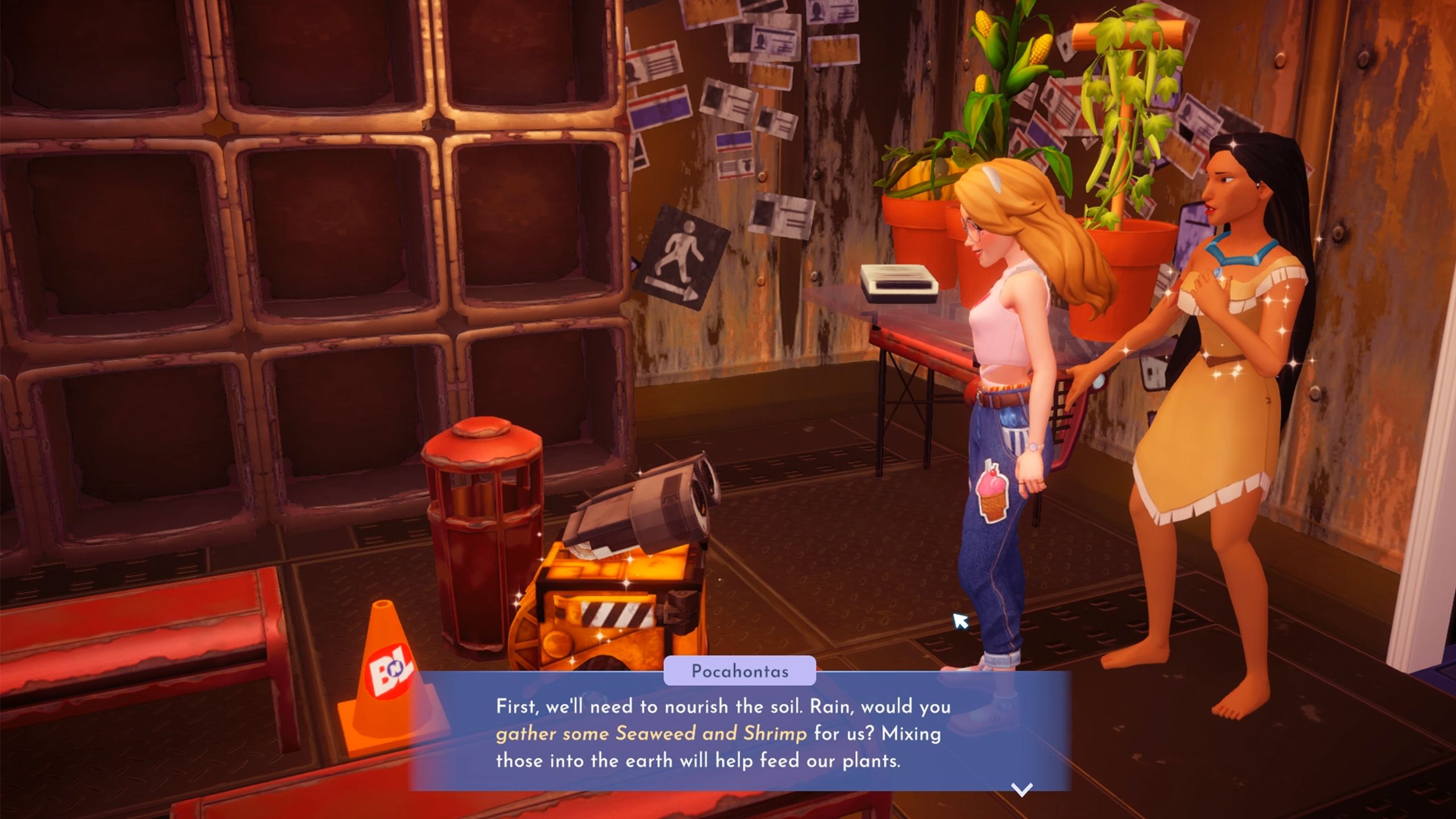 When you go back to Pocahontas, she notices the seeds are gone. Seeing tracks in the dirt, players realize WALL-E must have taken them to plant them.
