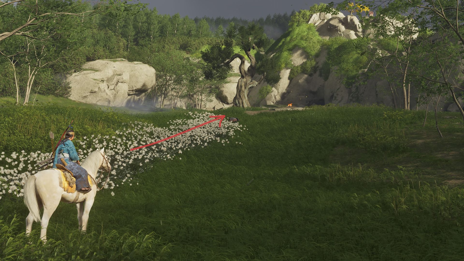 To locate the cave above Serpent’s Pass in Ghost of Yotei, simply track the Nupur River until you reach an area marked by a path of white flowers pointing towards the northwest.