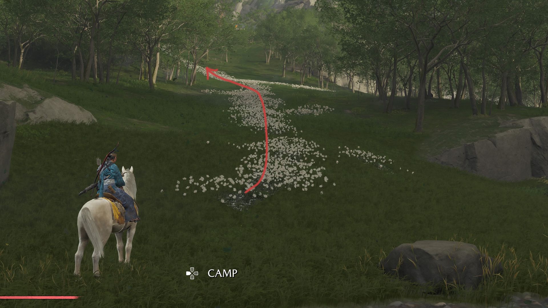 If you follow the path marked by the white flowers, you’ll quickly reach a well-known place called the Twisted Tree. You’ll find a wounded soldier from Matsumae there. Talk to him, and he’ll tell you that the Three Terrors have killed his comrades. People have tried to track down the Three Terrors, but haven’t been successful.