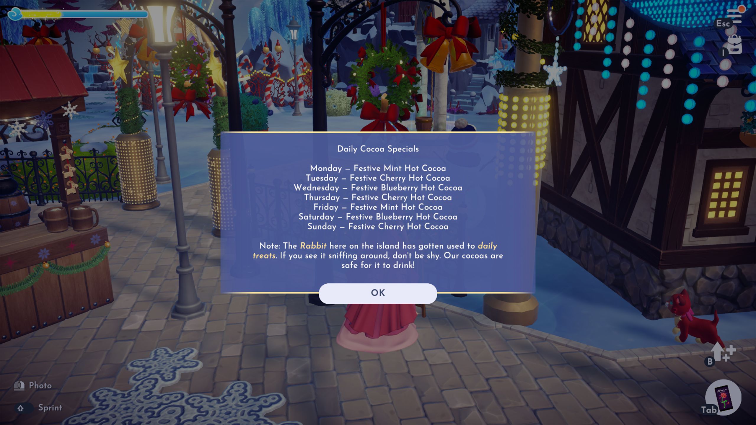 While exploring the winter island, you’ll find a large, frosty rabbit wandering around. Check the small blackboard inside the café by the Wishing Well – it displays the daily hot cocoa flavors and explains that the rabbit is friendly and enjoys cocoa. To complete the frosty rabbit puzzle in Disney Dreamlight Valley, give it a cocoa drink each day for four days.