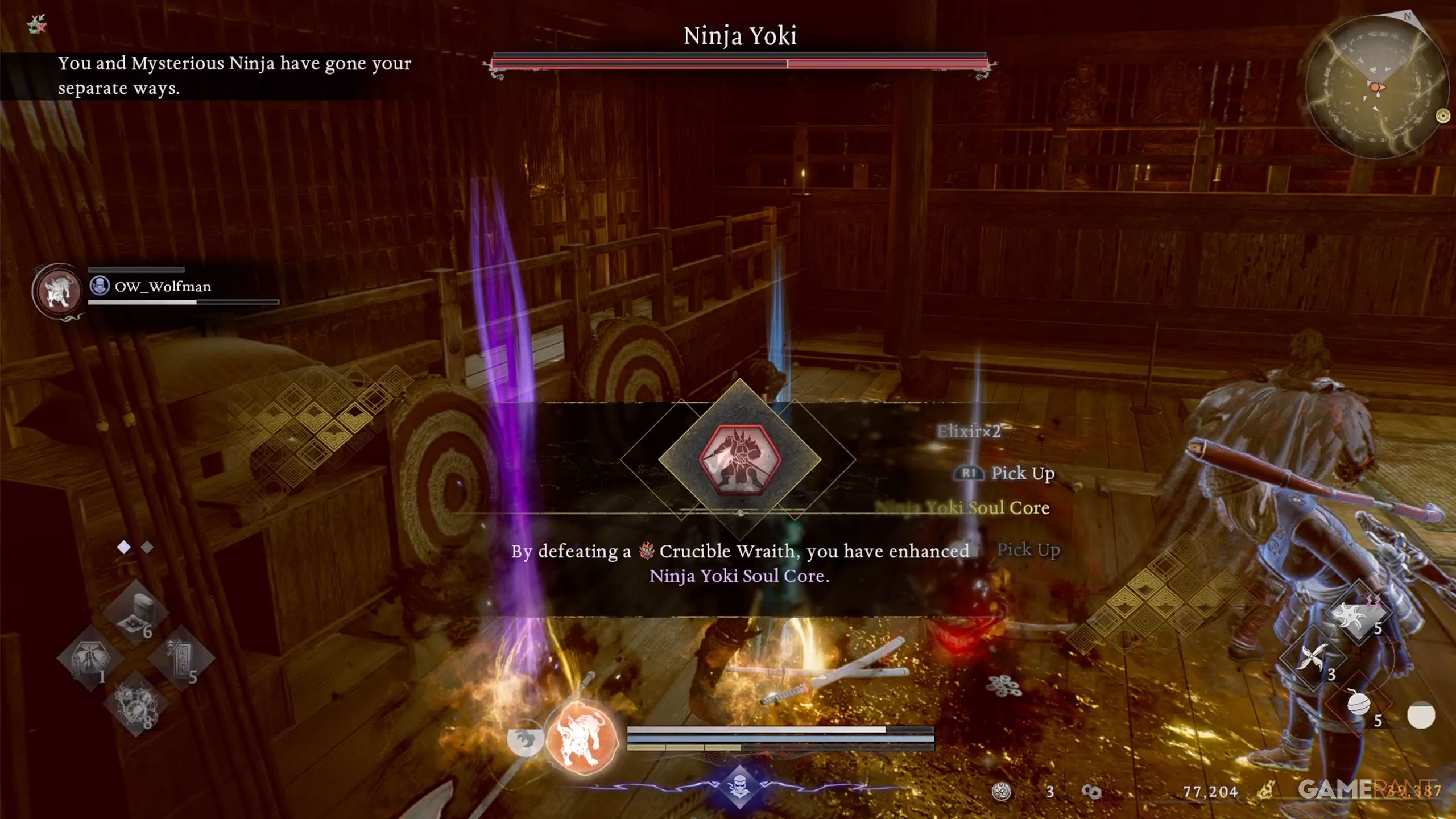 Return to the building and go inside to battle the enemies. After a while, Ninja Yoki will show up, and you’ll need to team up with him to defeat the Crucible Wraith. If you need assistance, you can summon an ally from a Benevolent Grave.
