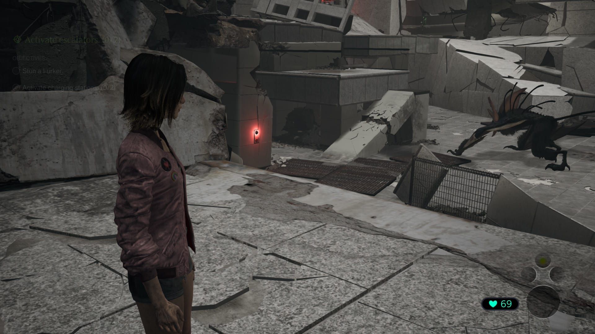 The Charging Station on the left is located behind some fallen debris at the back of the ground floor. To reach it, players need to crouch and carefully walk under the debris, making sure to avoid the Lurker. Once they get there, they can use the station to charge their smartwatch.