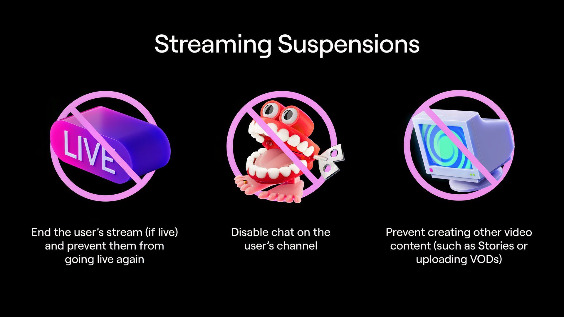 If someone breaks the rules specifically within chat, they’ll receive a “chat suspension.” This means they won’t be able to participate in chats on other people’s streams, but they can still stream and interact with viewers on their own channel. This is good news for creators, as they can continue to build their community even while serving a penalty for inappropriate chat behavior elsewhere.