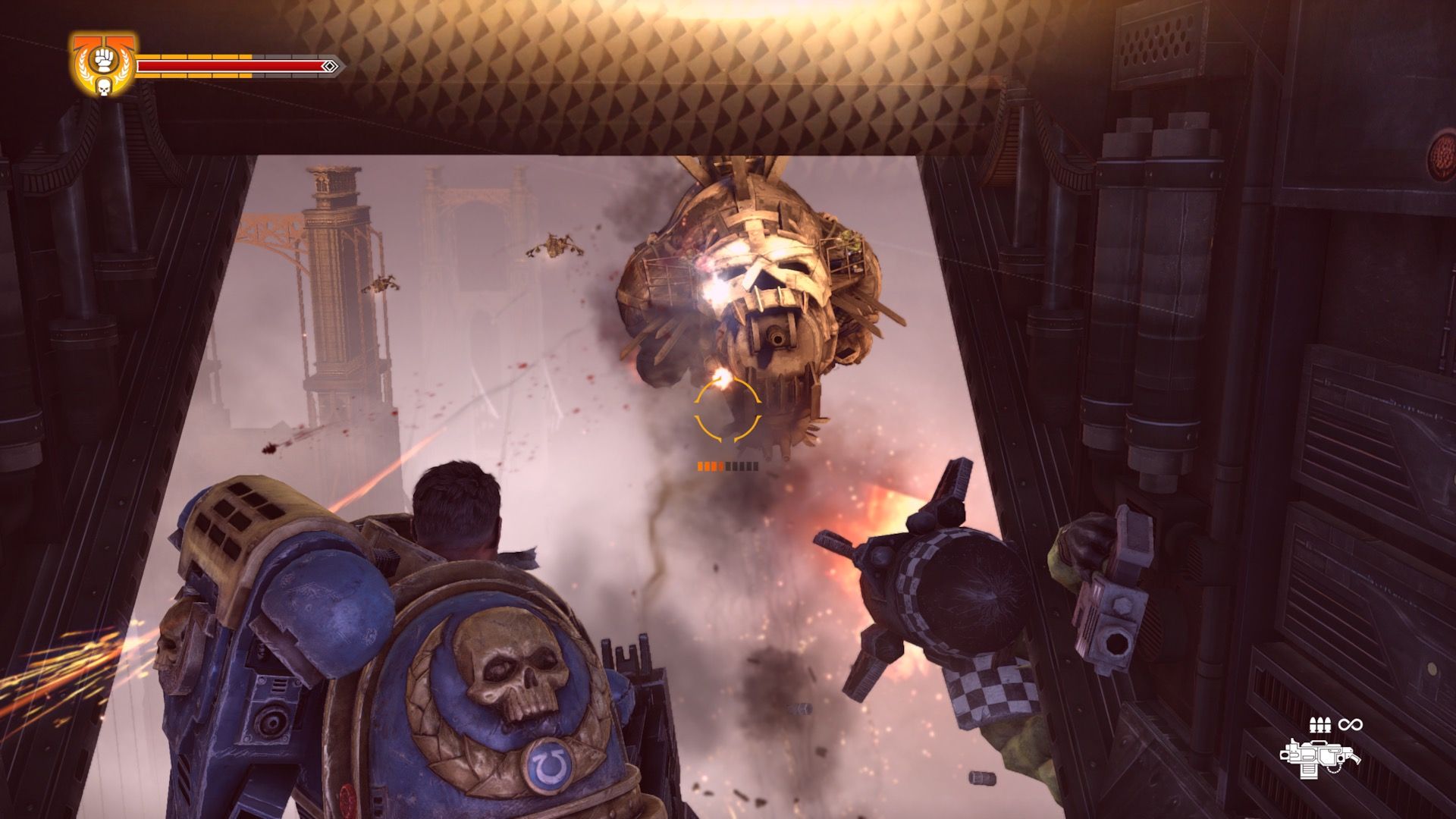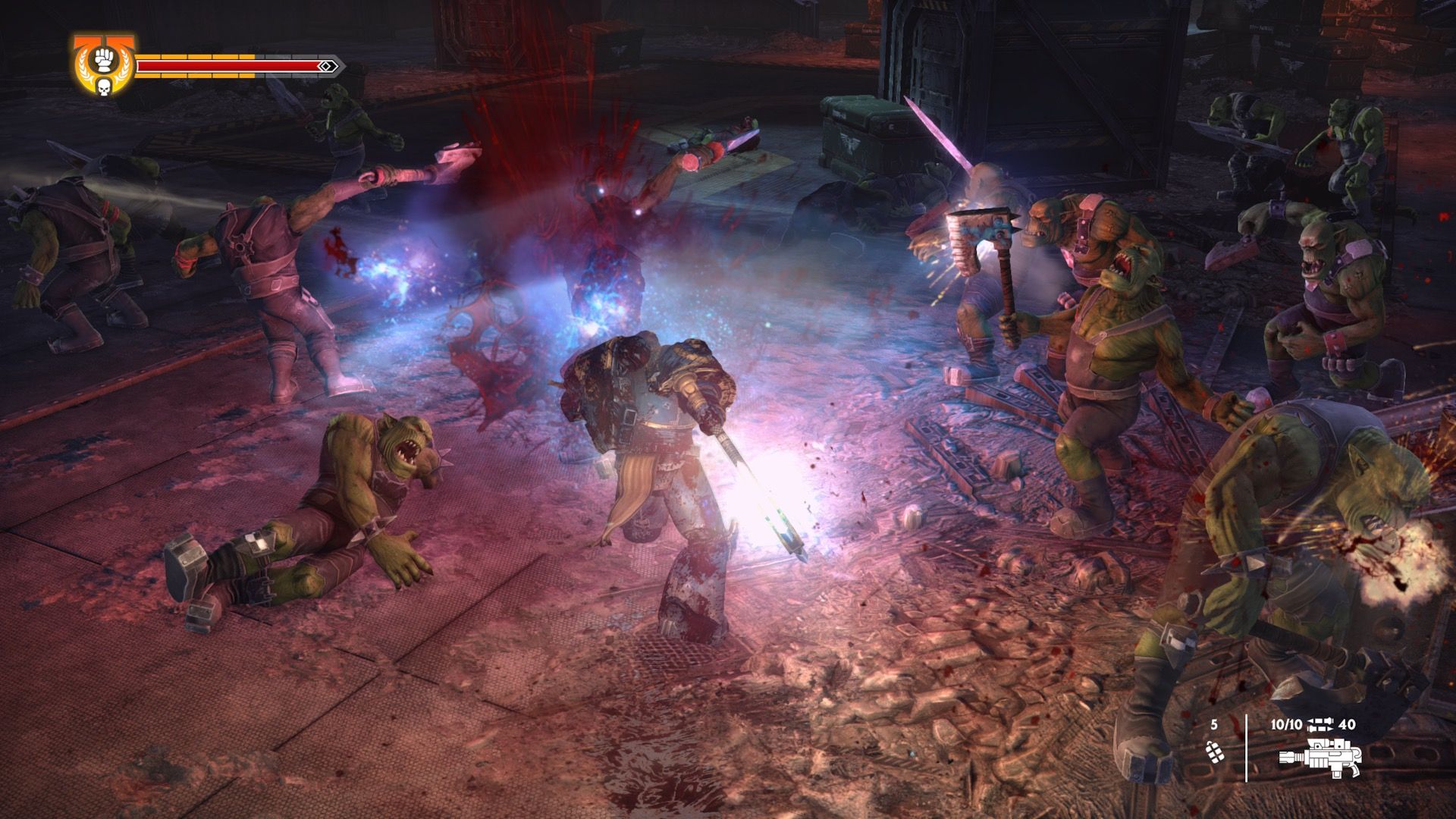 The game features straightforward levels where players battle large groups of Orks using a variety of weapons, from traditional firearms to powerful melee options like chainsaw swords. It feels similar to Gears of War in its overall style, but emphasizes more aggressive, fast-paced combat and less reliance on taking cover.