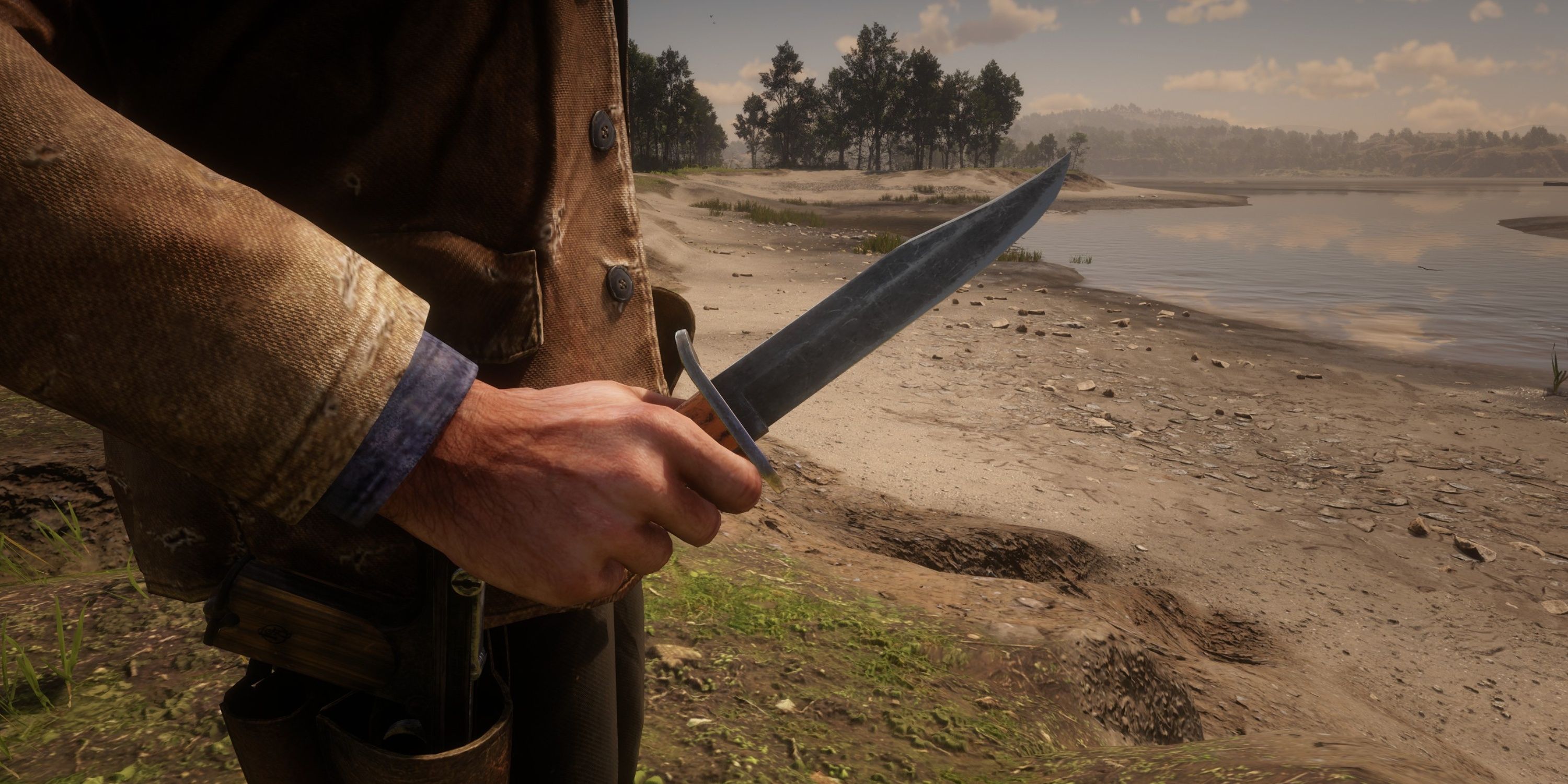 In this game, every player is initially equipped with the Hunting Knife, which cannot be removed from their inventory. This versatile tool serves multiple purposes: it’s used for skinning animals as well as for performing stealth kills. Furthermore, it can be personalized to give it a unique look that reflects each player’s individual interpretation of Arthur Morgan.