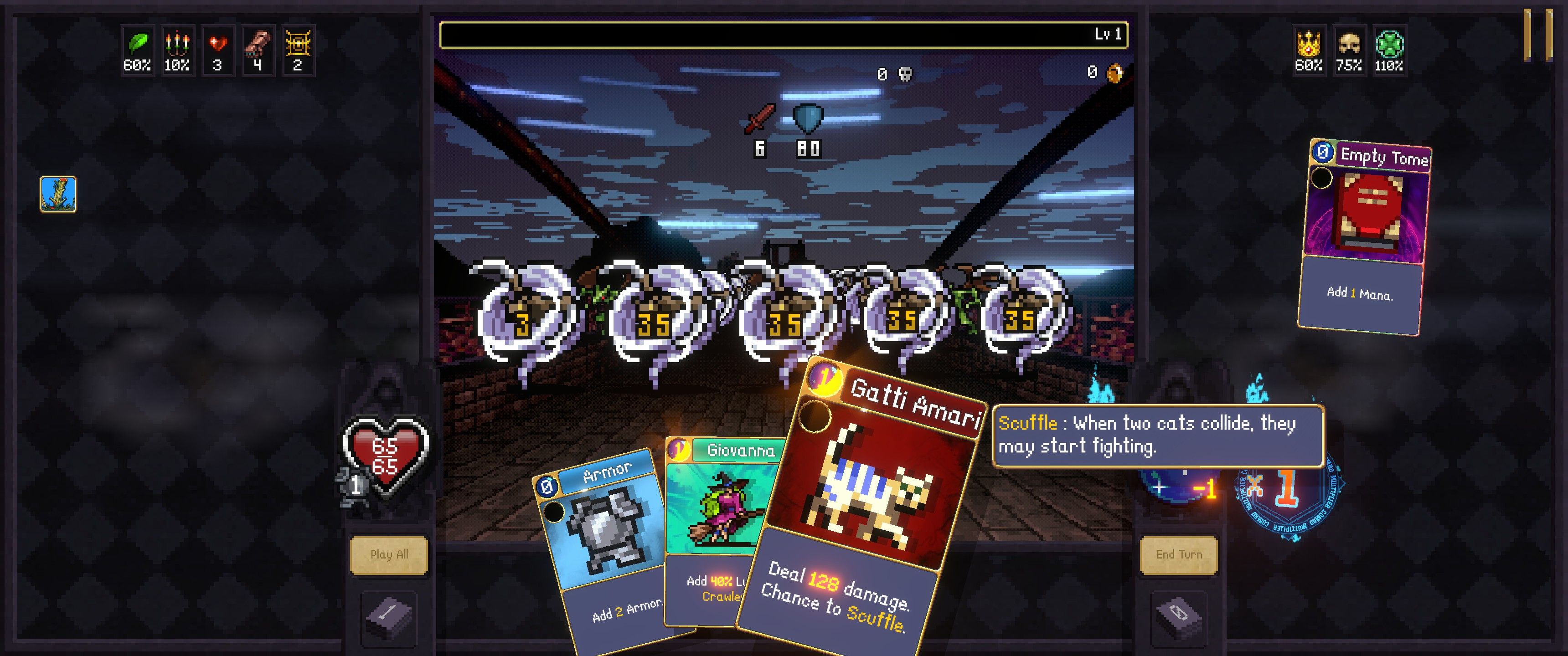 To play cards, you need mana, which automatically refills each turn or can be restored by certain cards. Enemies will attack, and if your health reaches zero, your run is over – though you can use armor cards to reduce damage. As you play, you’ll earn coins to unlock helpful upgrades in the Village, making future runs easier. You can also choose a companion, called a Crawler, who comes with a unique weapon and special abilities, like doing more damage or providing better healing.