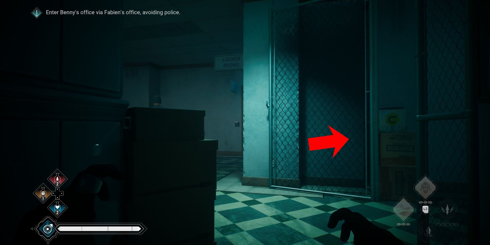 Start from Fabien’s office. Sneak behind the lockers and wait until the people in the office have left the hallway near the evidence room. Then, crouch low under the window to stay hidden from the officer in the hallway office, and open the door to the evidence room.