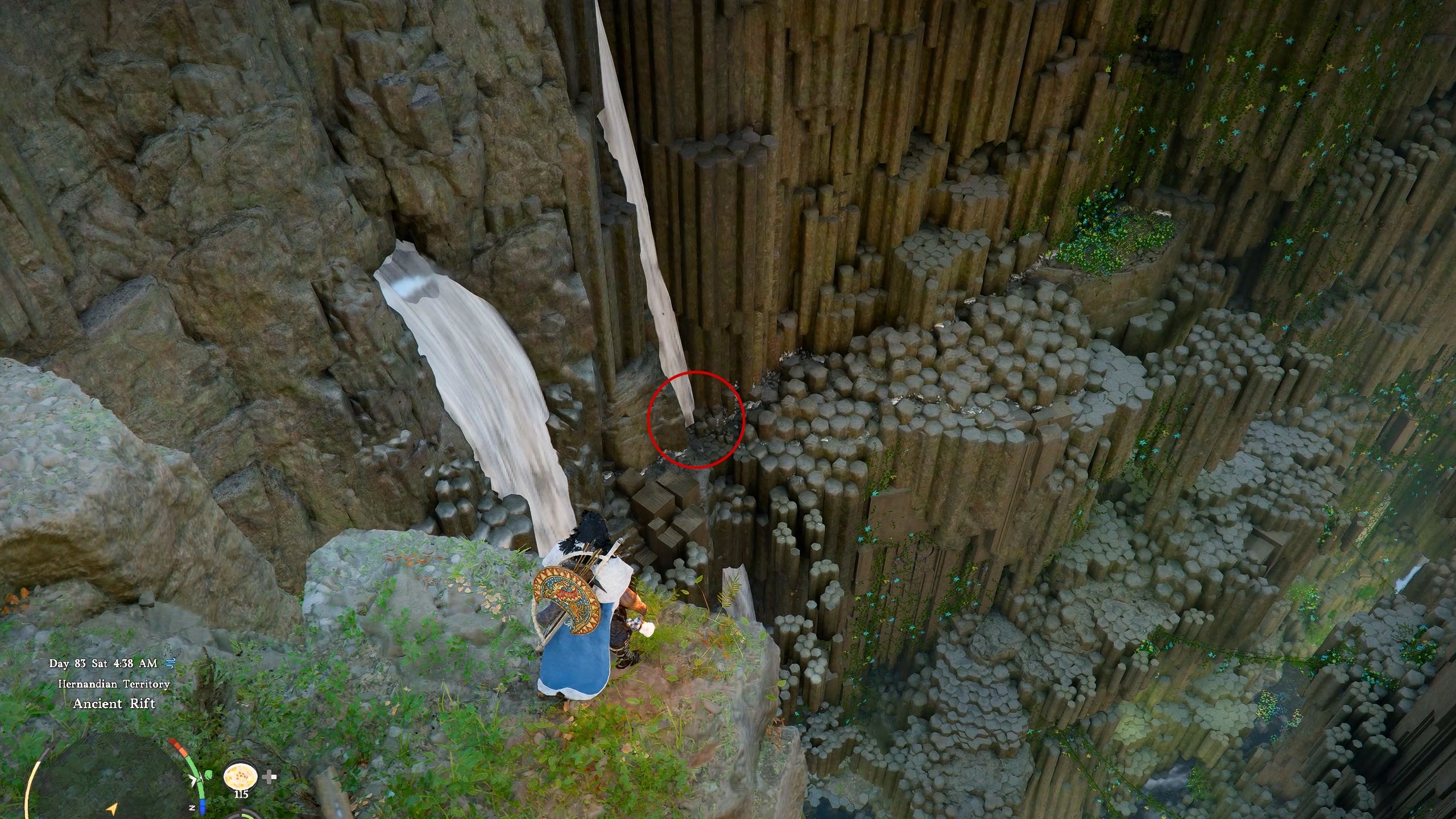 You’ll come to a large gap in the ground with strange, geometric structures and waterfalls. Stay to the left and follow the edge of the Ancient Rift until you see two waterfalls next to each other. Then, glide down to the one on the left.