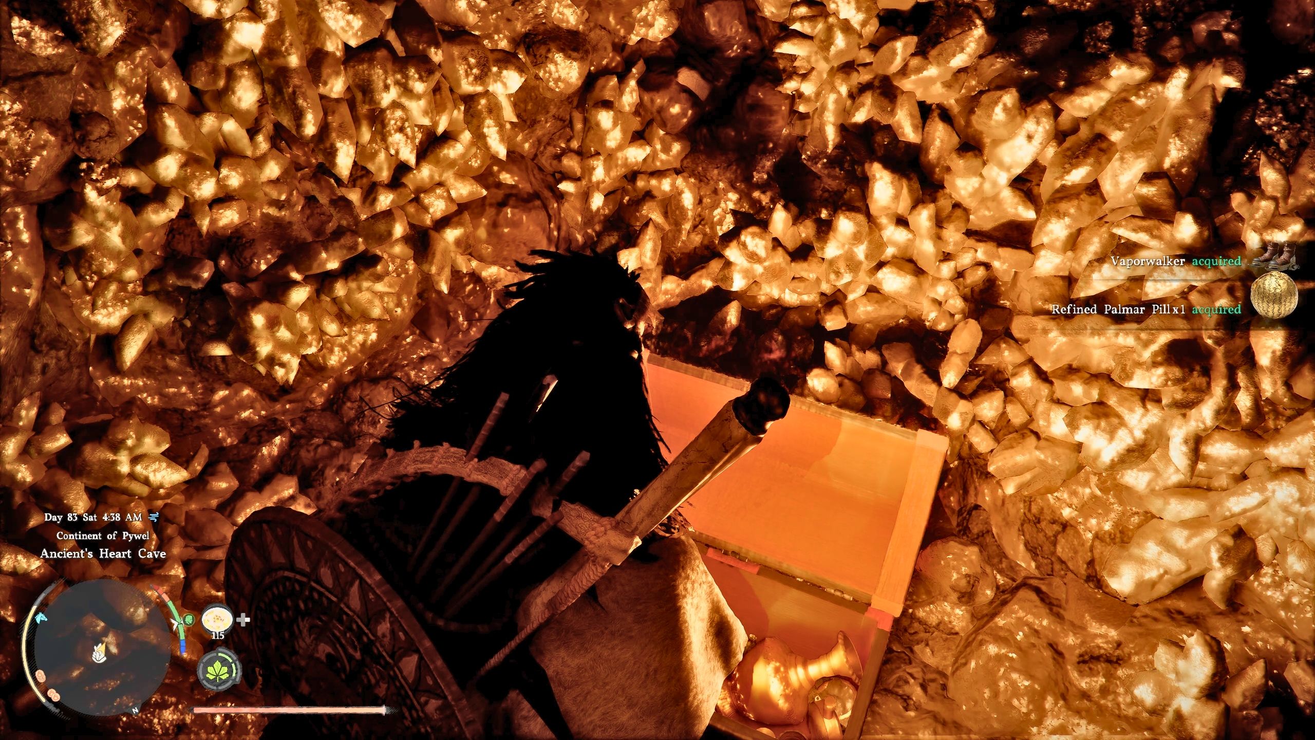 When you first enter the Ancient’s Heart waterfall cave, use strong attacks or a Force Palm to break the boulder at the entrance. Inside, you’ll discover a treasure chest containing a Refined Palmar Pill and the Vaporwalker Boots, both found in the Crimson Desert.