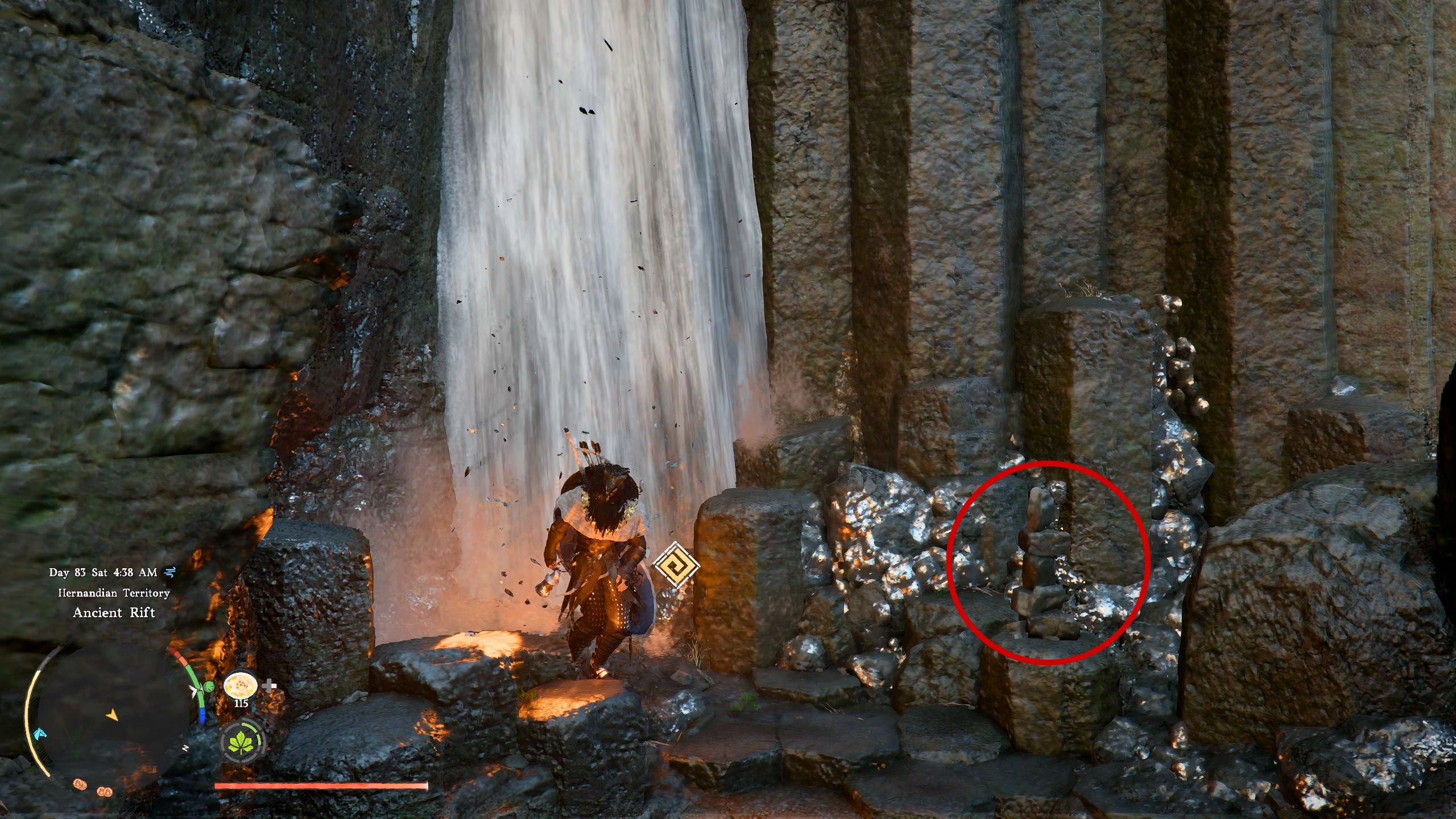 Okay, so once you land near the waterfall, look for a little stack of stones – that marks the way to the Ancient’s Heart Cave! To get inside, you just need to walk up to the waterfall and do that Stab move – that’s pressing RB and Y together on Xbox, or R1 and Triangle on PlayStation. If you do it right, Kliff will be able to walk right through the water and into the cave hidden behind the waterfall!