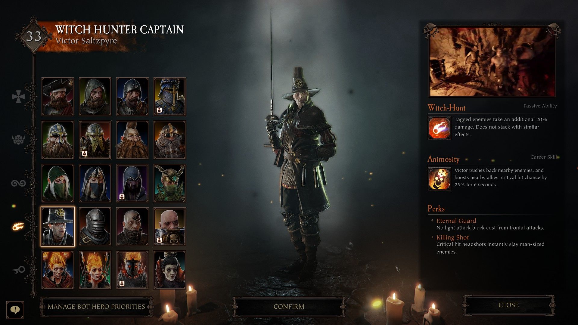 Elite Killer Hunts down elites and special enemies Huntsman Kruber Witch Hunter Captain Saltzpyre Waystalker Kerillian Ranger Bardin Pyromancer Sienna