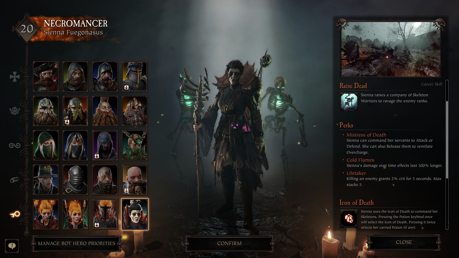 Besides being able to quickly eliminate regular enemies, Necromancer Sienna excels at taking down tougher opponents like specials, elites, and bosses. This is thanks to her enhanced damage-over-time abilities and naturally higher critical hit rate. Her Reaping perk, which gives her an endless Cleave attack, is particularly effective against large groups of enemies.