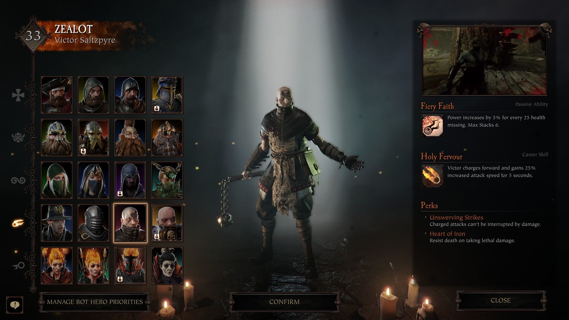 If you’re looking for a character build that can quickly defeat both single enemies and large groups while gaining a lot of temporary health, the Zealot is an excellent choice. This subclass for Victor Saltzpyre takes advantage of his fast weapon speed and boosts it even further with the Holy Fervour ability. Because you’ll be attacking so rapidly, the Second Wind perk becomes incredibly useful, giving you temporary health every time you stagger an enemy – and you’ll be staggering them constantly.