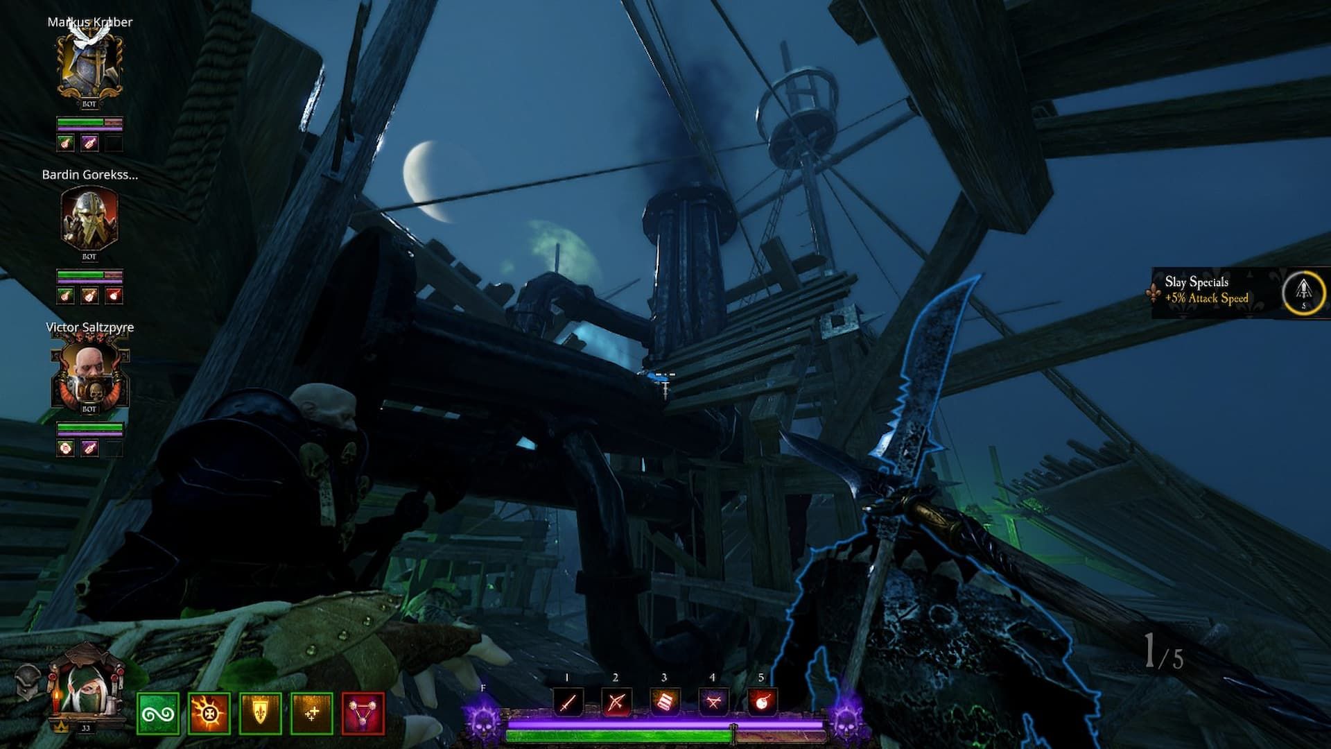 If a Skaven attempts to board your ship, immediately board theirs. After that, turn to the right and search for the Grimoire – it’s wedged onto the roof close to the chimney.