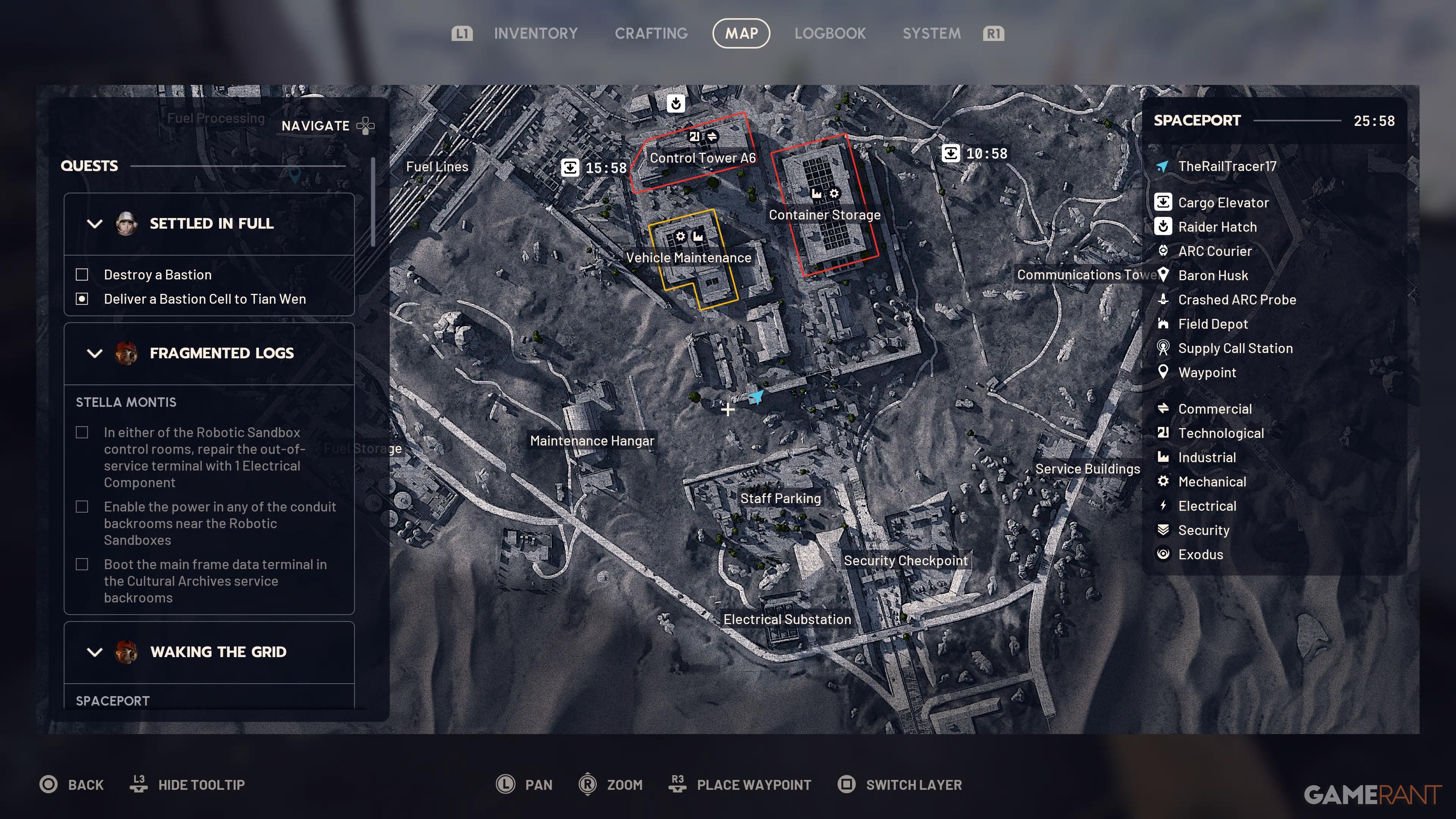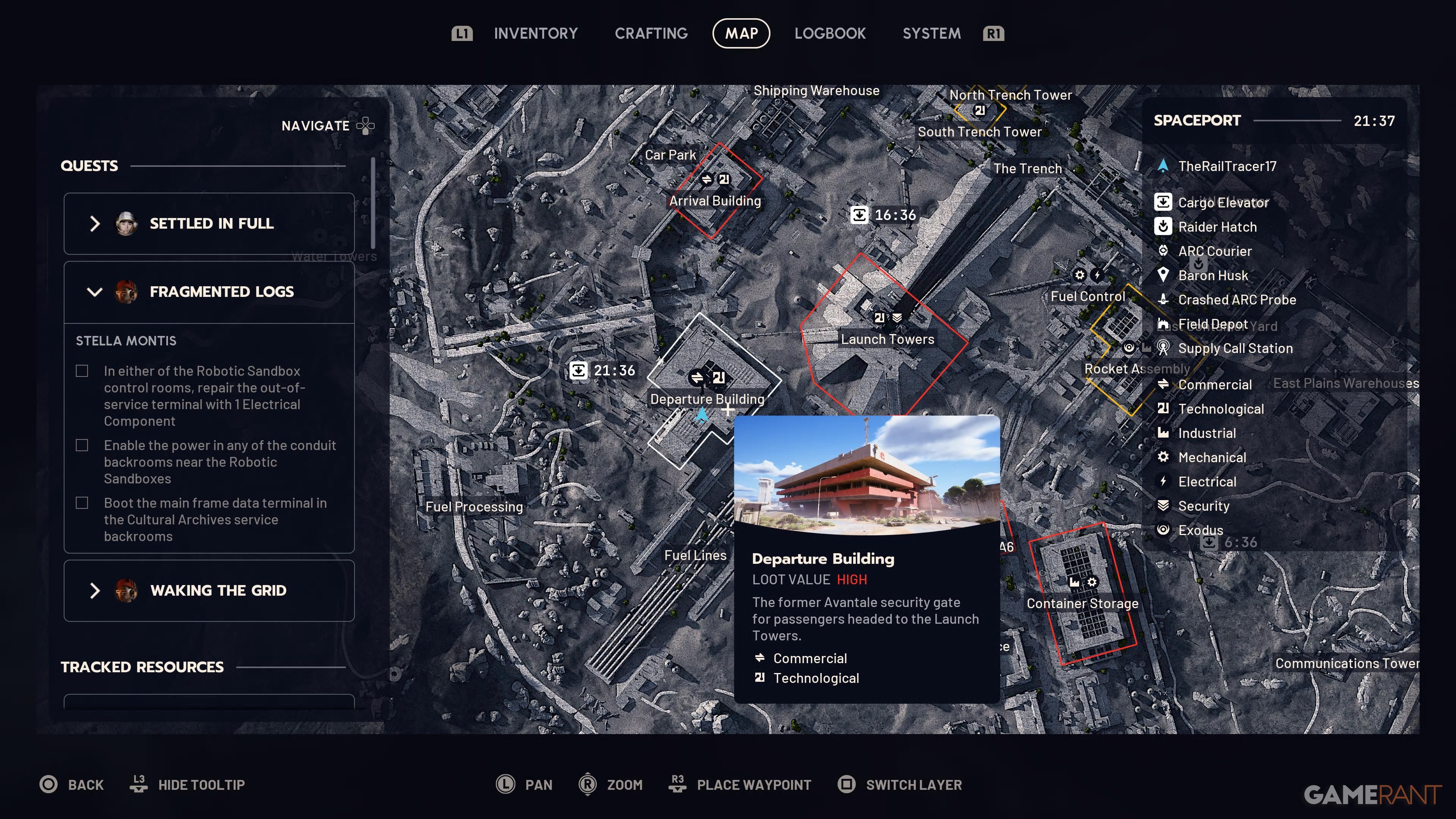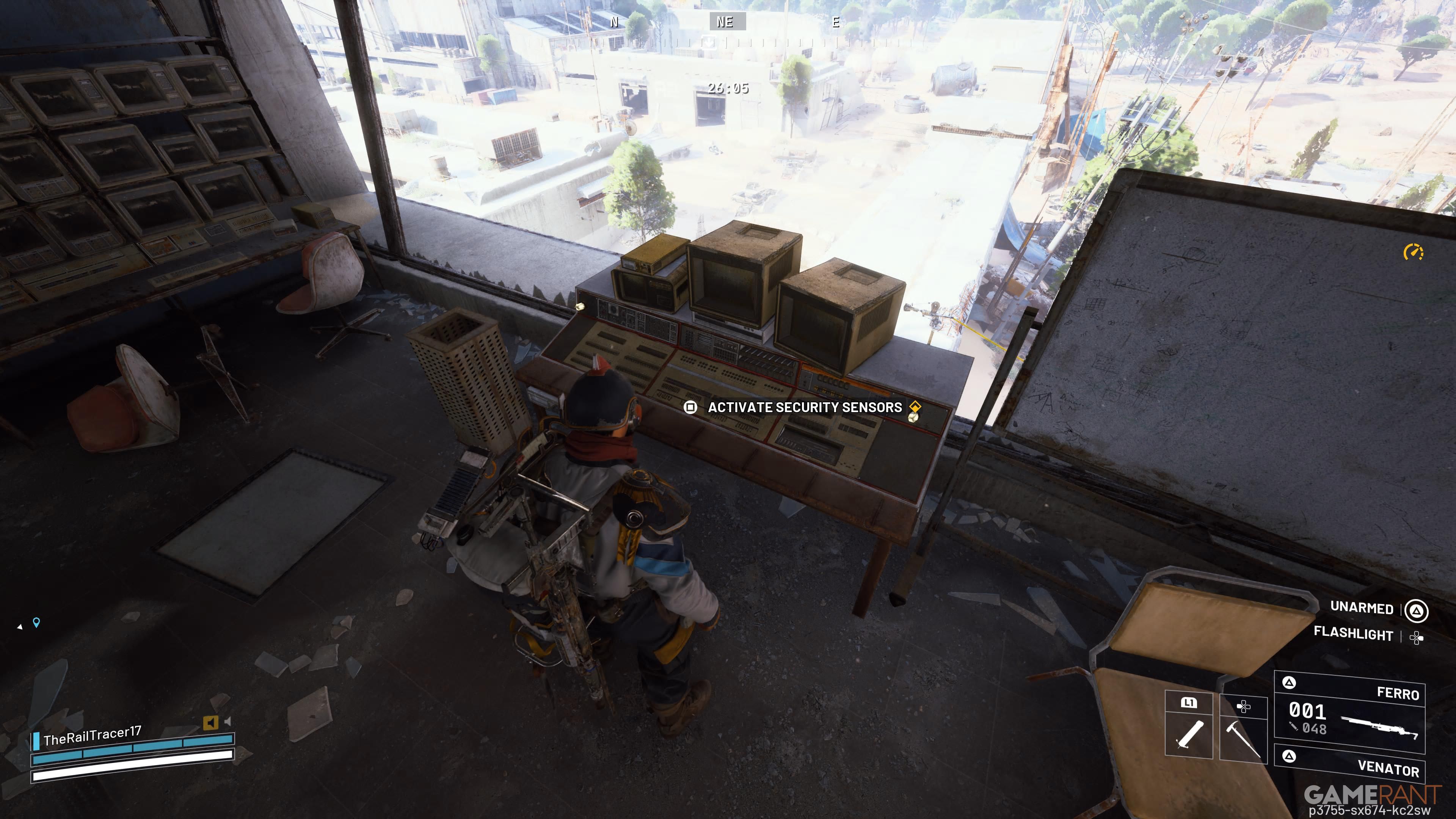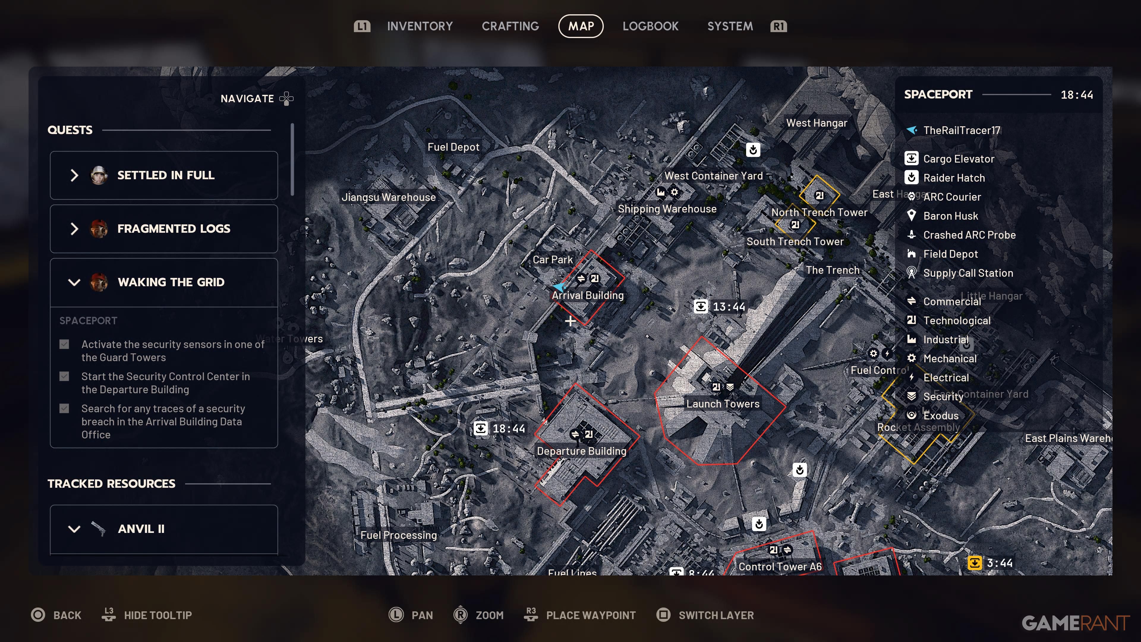 To start the quest, you need to turn on the security sensors. You can do this at any of the Guard Towers around the edge of the Spaceport. Since your next goal is at the Departure Building, it’s a good idea to find a Guard Tower close by. When you find one, use the zipline to get up and then activate the sensors using the computer.