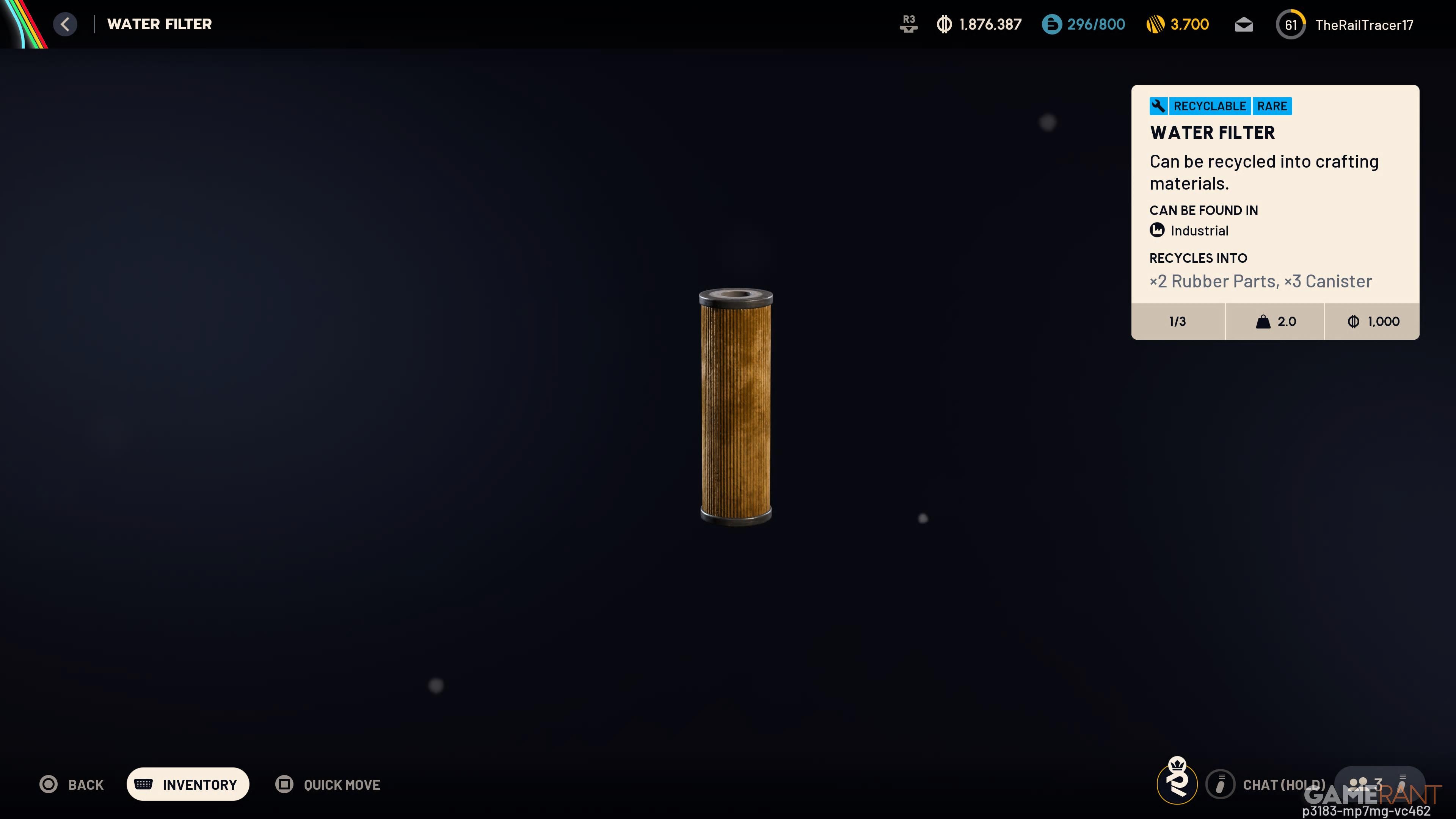 Okay, so the Water Filter is something you can sell for 1,000 coins. But honestly, I usually break it down for parts – you get two Rubber Parts and three Cannisters from each one. If I’m farming these, I head straight for the Industrial areas. The great thing is, you don’t need to worry about keys or fighting over them, so I like to keep my loadout light and just run in and grab them.