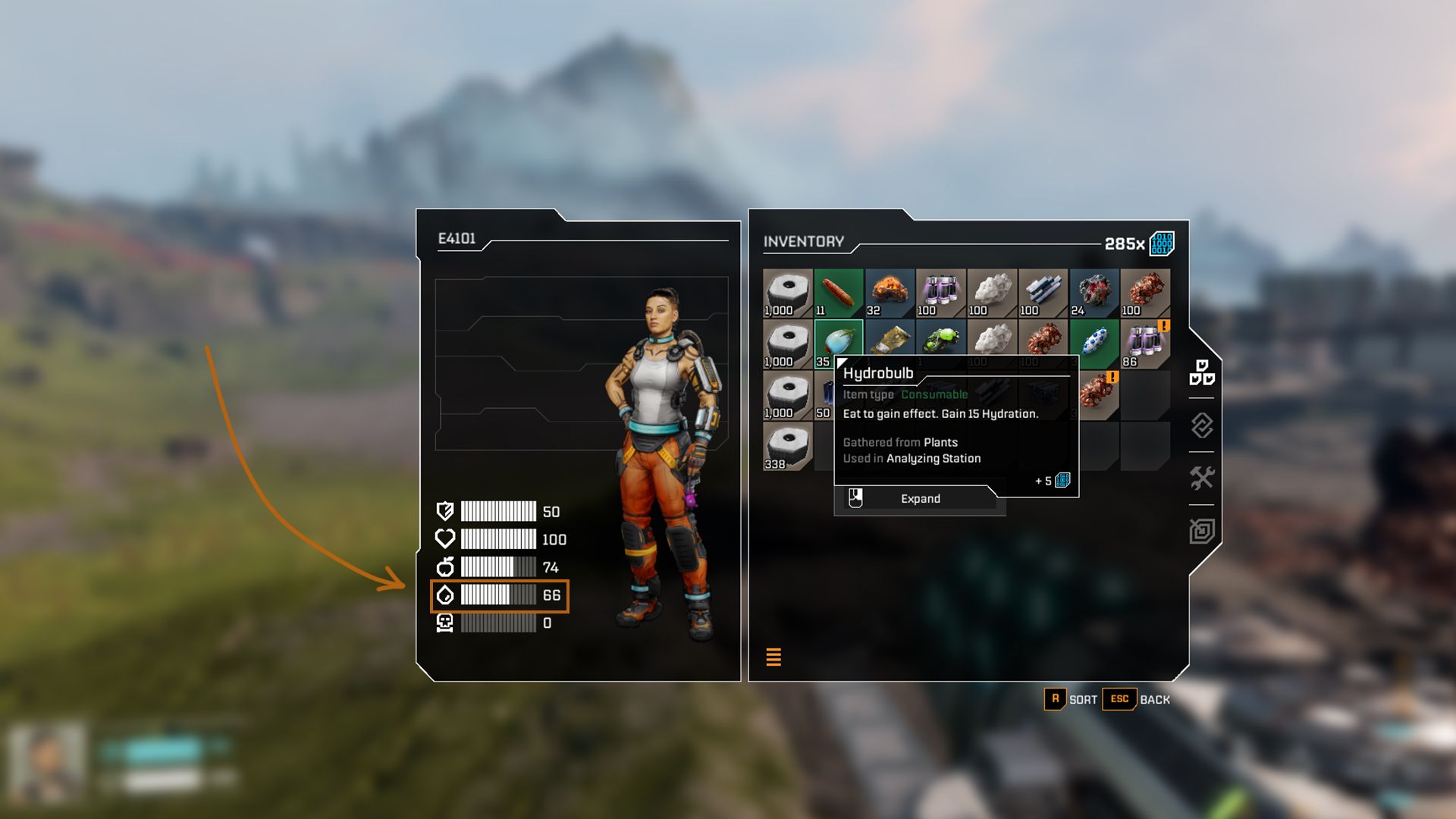Click the ‘Use’ button to have your character drink the Hydrobulb, restoring their hydration.