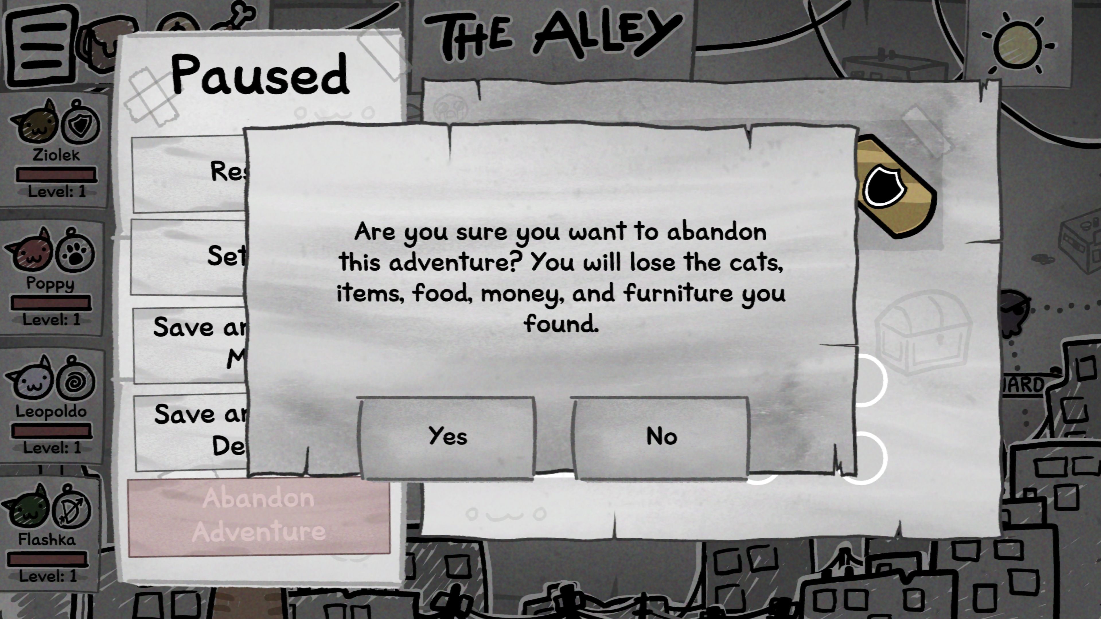 You might have seen a button to ‘Abandon Adventure’ in the pause menu. It looks like a way to go home with all your stuff – your cats, items, food, and money – but it actually doesn’t affect what happens in the game.