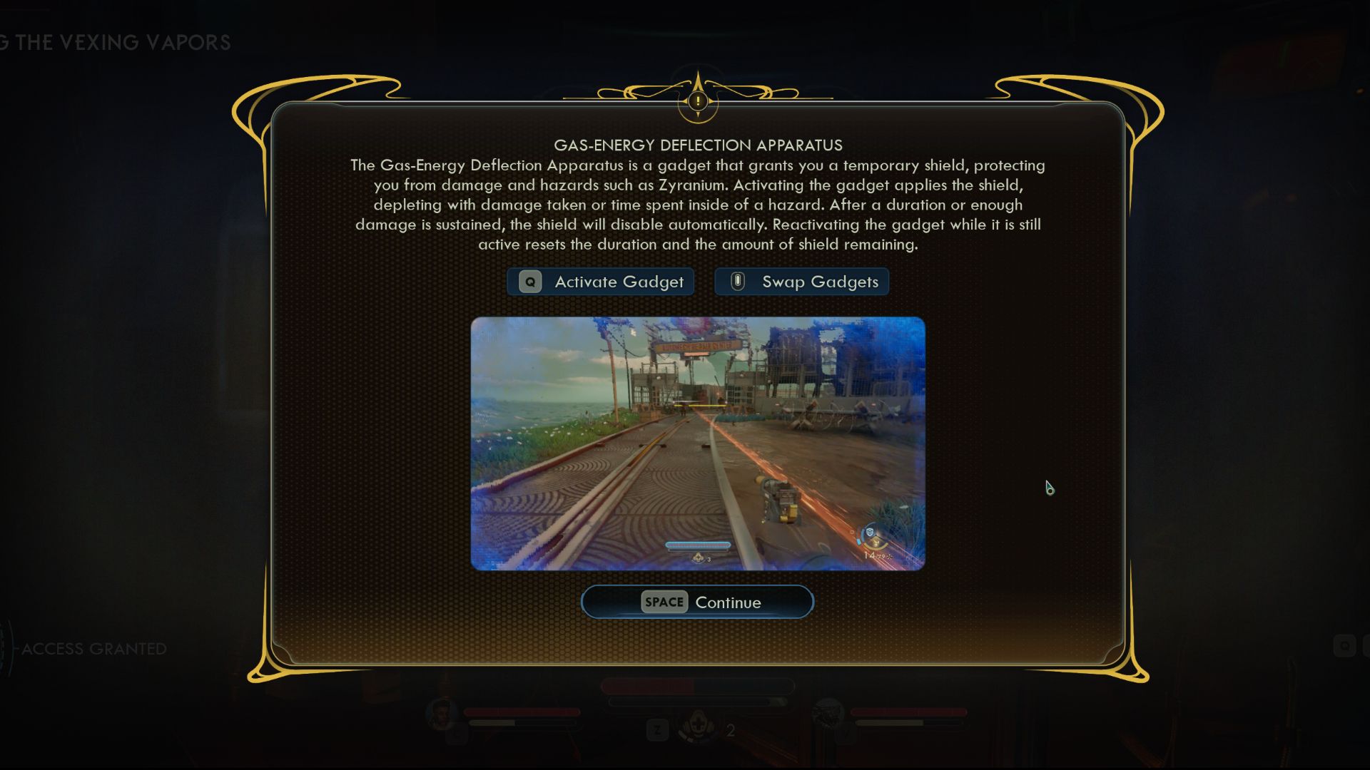 - The Gas-Energy Deflection Apparatus is essentially a temporary shield Gadget that can also mitigate status effects and environmental hazard damage. You can swap to this Gadget instead of your Time Dialation device.