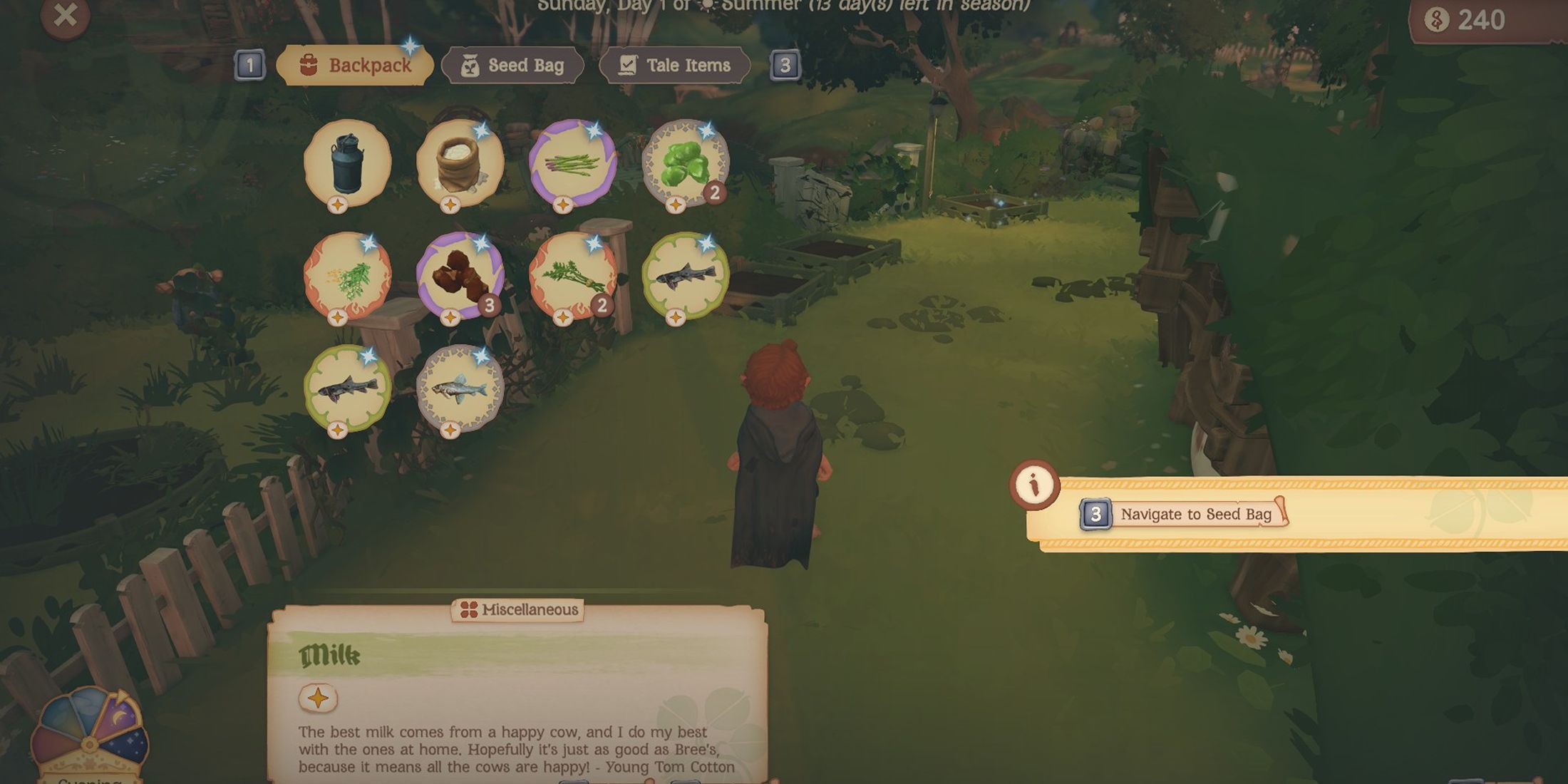 Scattered throughout the area are various items that players can pick up, provided they have room in their inventory. Exploring the Shire and gathering resources is essential each season because it allows you to stockpile food, accumulate extras for trading with neighbors, and obtain crucial components for preparing exceptional dishes.