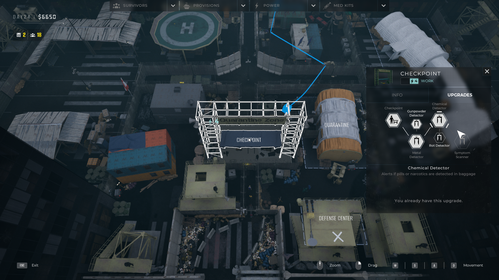 Upgrading the checkpoint in Build Mode makes it simpler for players to search survivors for hidden items. There are three upgrades for the detector, and each one adds a new alert that notifies players when a specific type of contraband passes through security.
