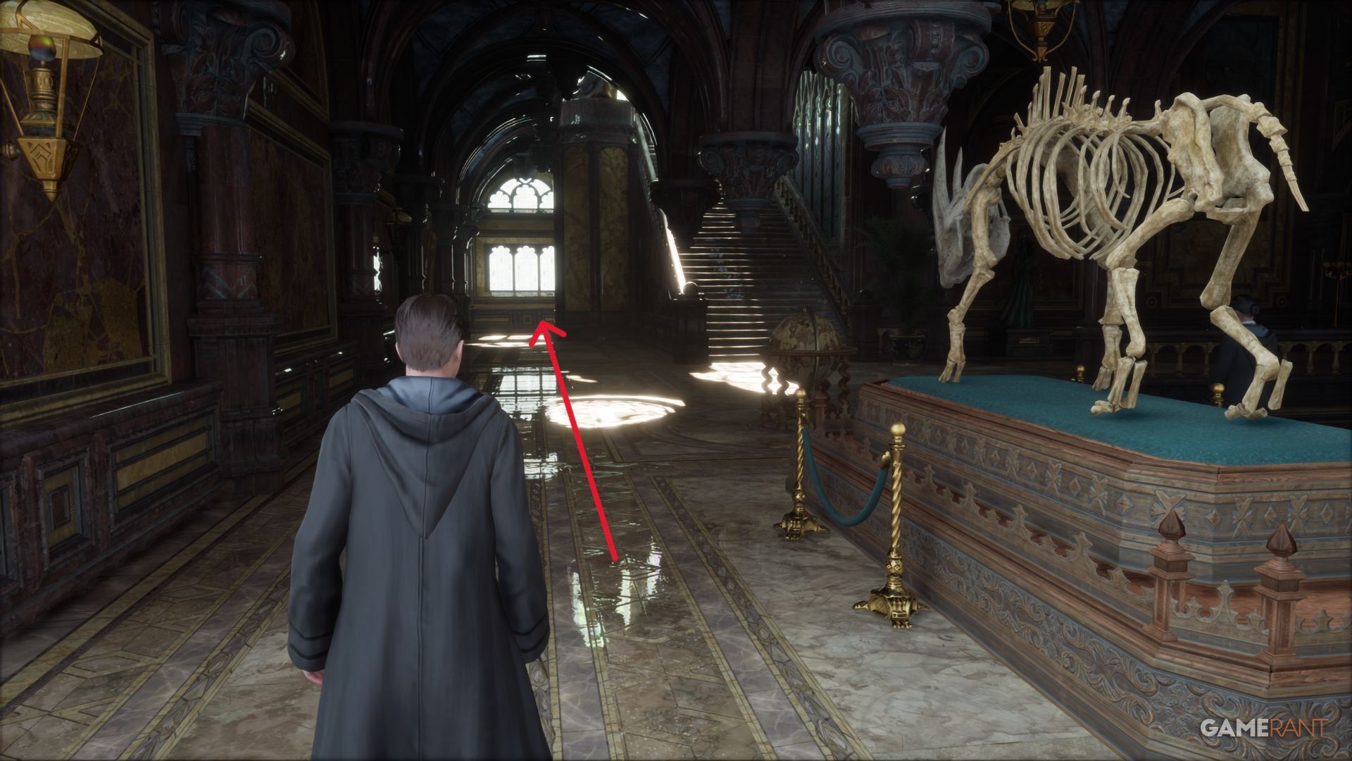 Starting from the Transfiguration Courtyard Floo Flame, players can go through the double doors into the tower, climb the stairs, and turn left to find the skeleton, which indicates the way to the Undercroft.