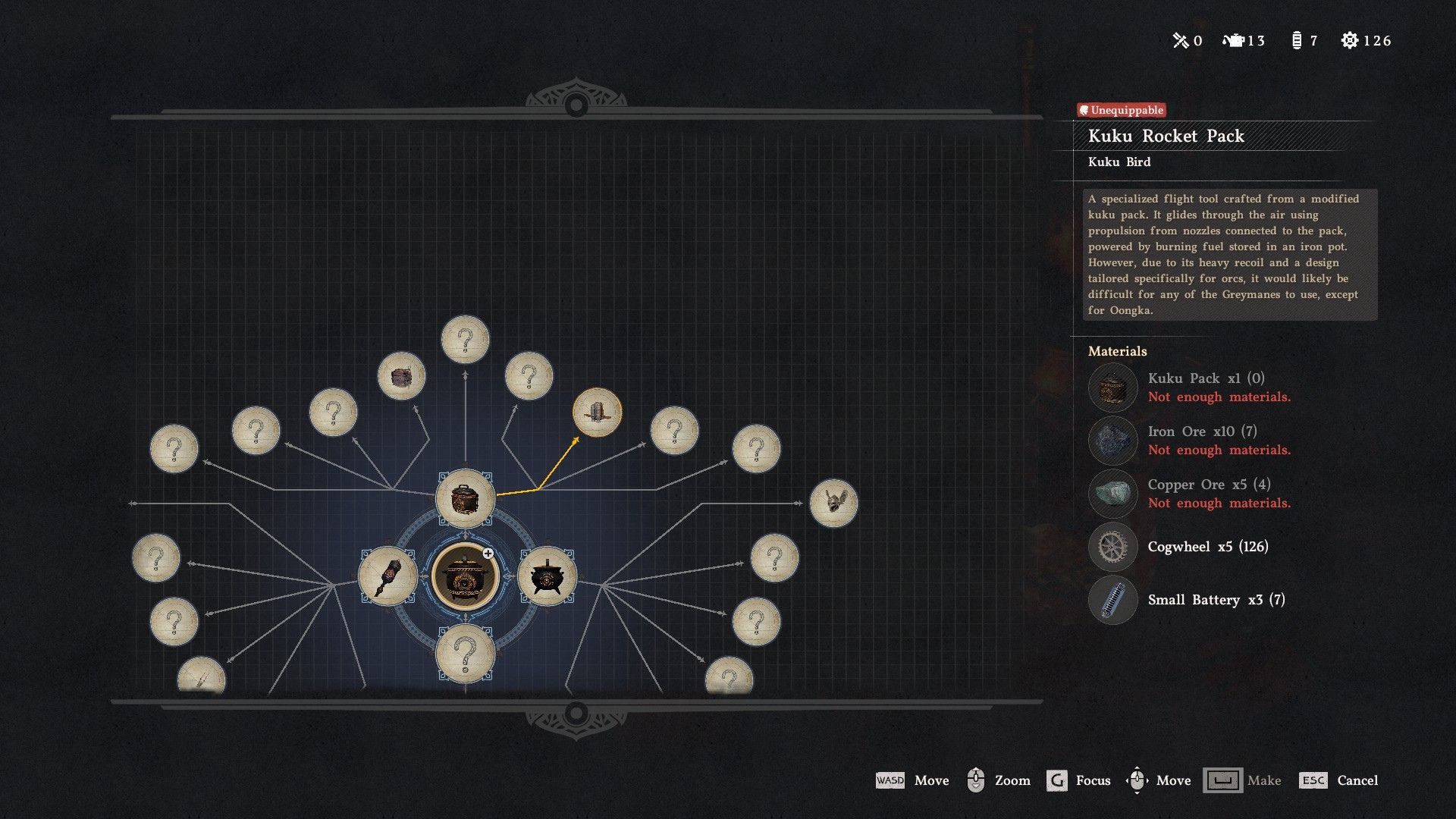 To build a Kuku Rocket Pack, you’ll need these materials: 1 Kuku Pack, 5 Copper Ore, 10 Iron Ore, 5 Cogwheels, and 3 Small Batteries.