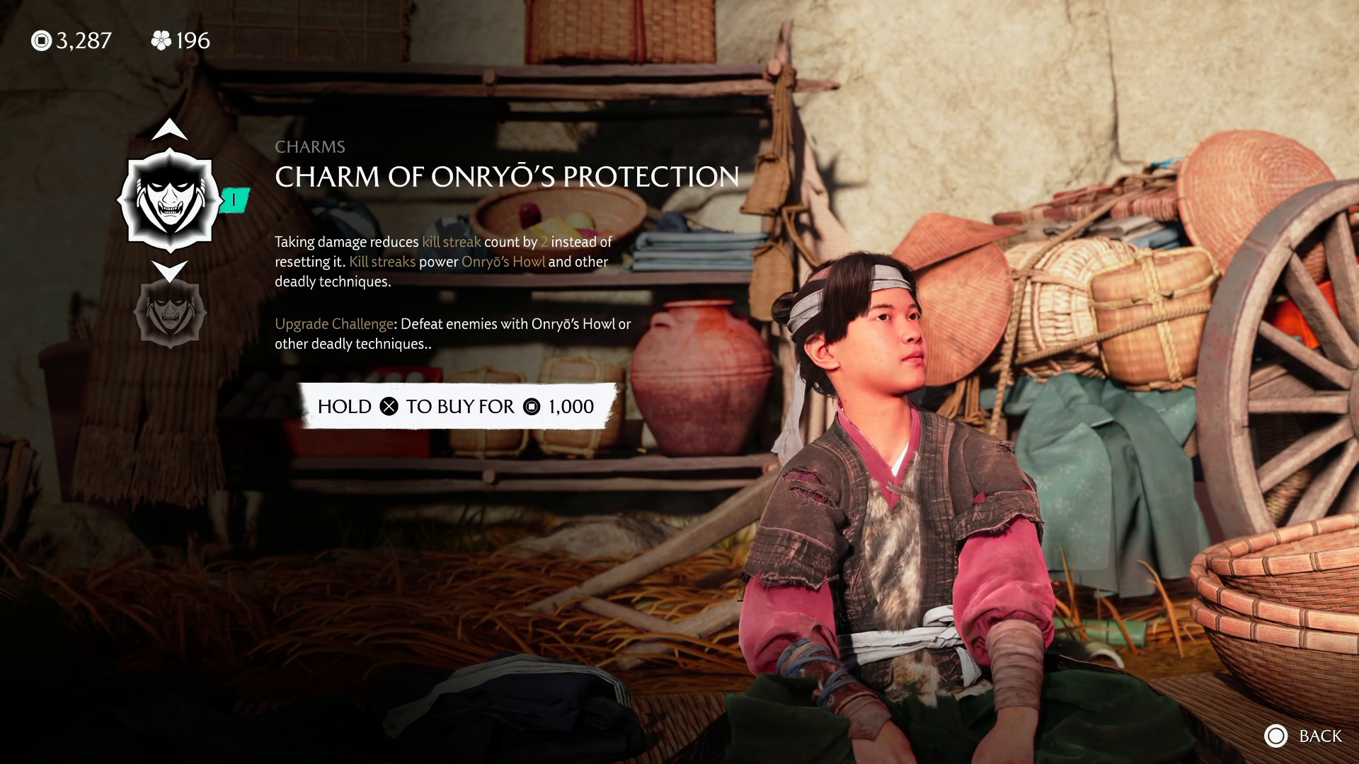 Charm of Onryo’s Protection | Taking damage reduces kill streak count by 1 instead of resetting it. It cannot be reduced past 1. Kill streaks power Onryo’s Howl and other deadly techniques. | Purchase from Taro the Scavenger for 1,000 mon after reaching Chapter 3. |