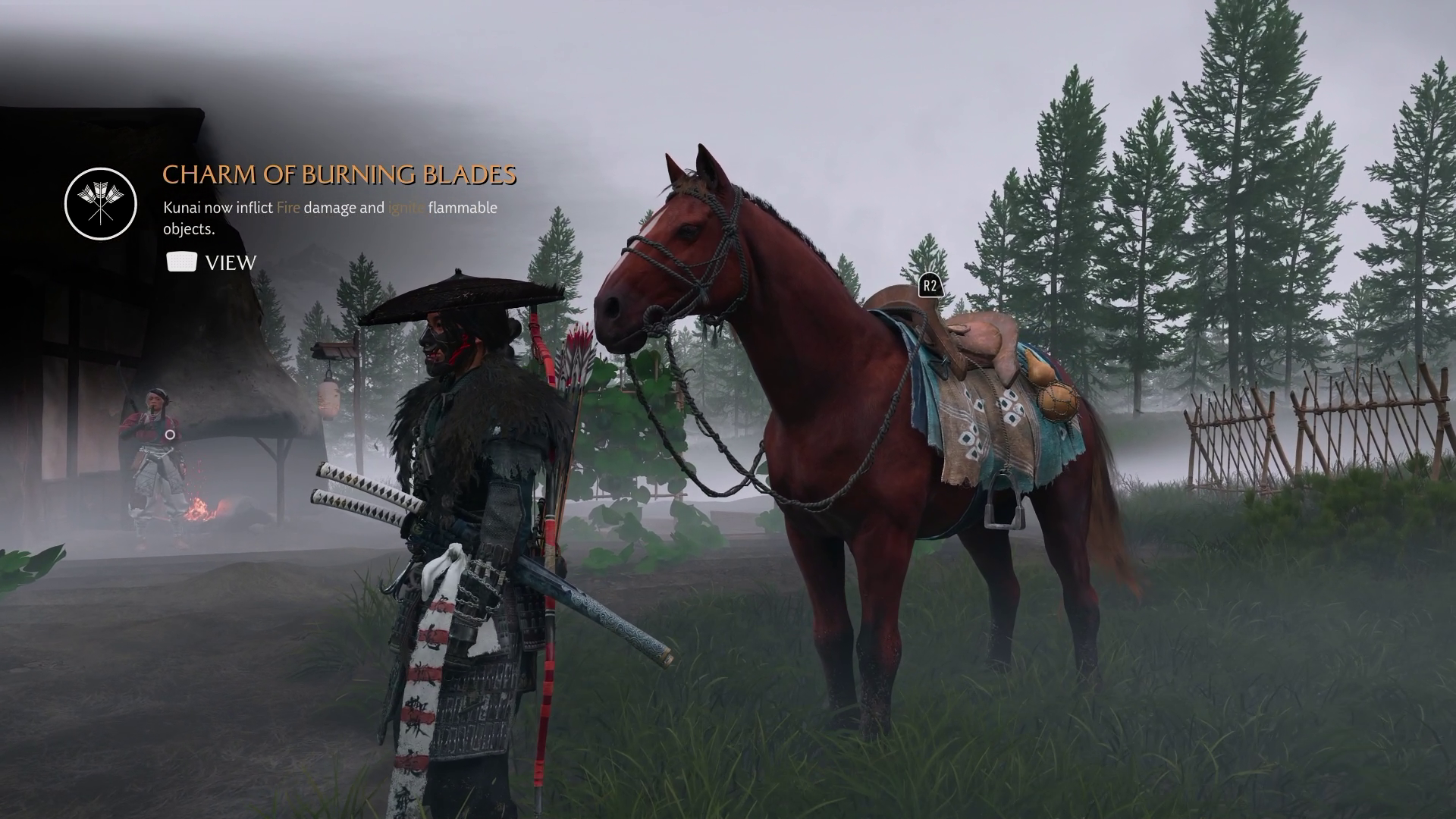 Charm of Burning Blades | Kunai now inflict Fire damage and ignite flammable objects. | Complete the “The Winter Farms” Sensei Tale in Teshio Ridge. |