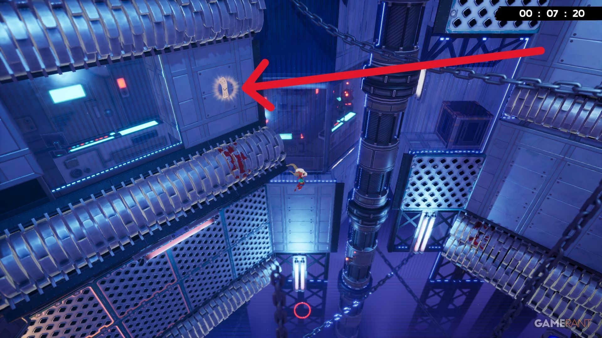 This area features a tall wall running through the middle, with lasers that blink on and off. The Bandage is located high on this wall, so players will need precise timing to avoid the lasers and reach it.