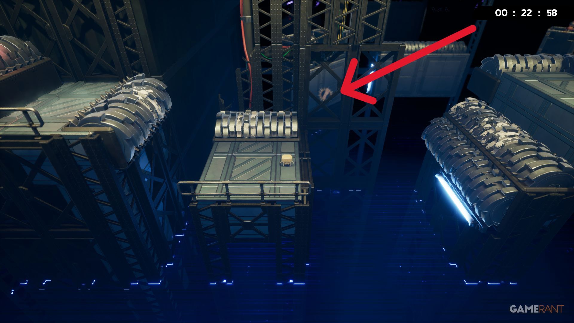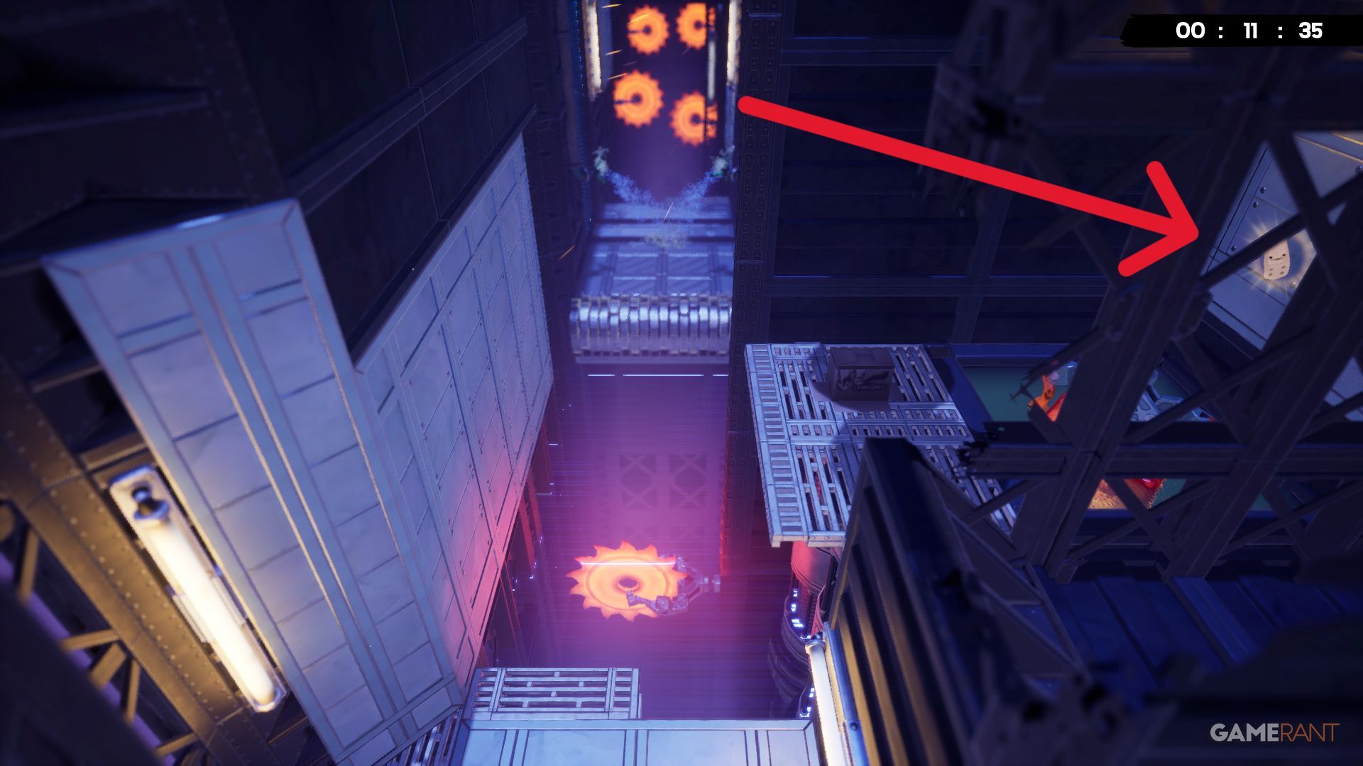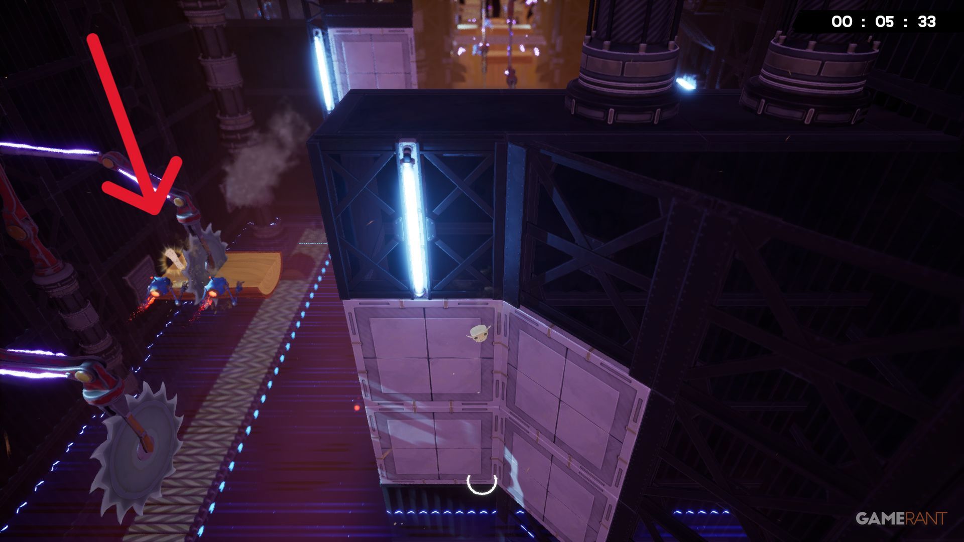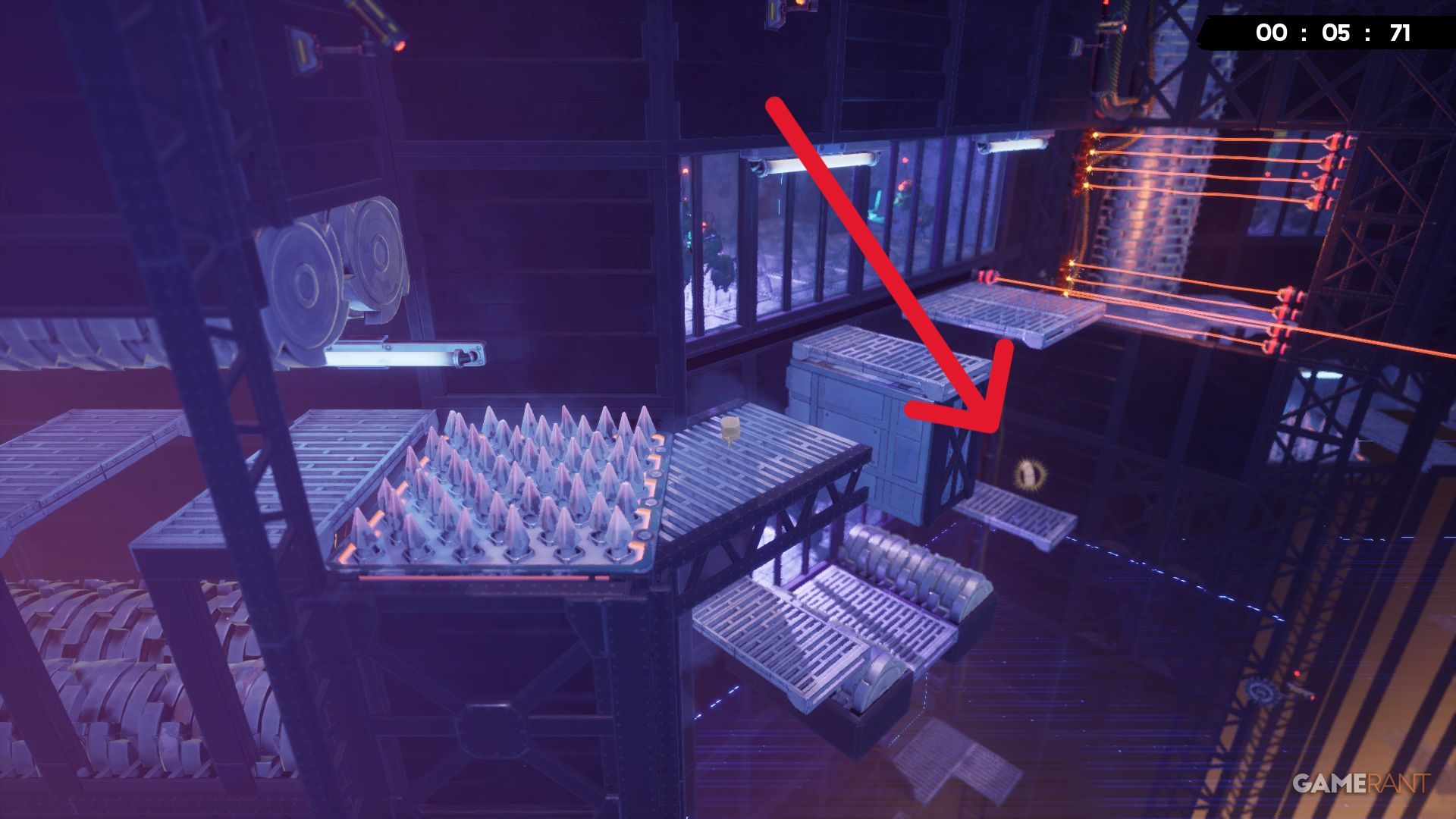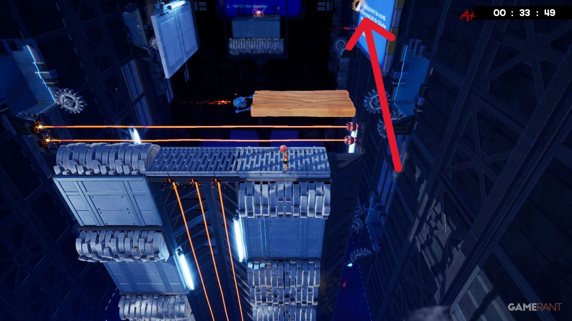 Near the beginning of the ‘Who Built This?’ level, players will encounter a moving laser they need to jump over. The Bandage is visible in the distance, requiring players to drop down to it and then climb back up to continue.