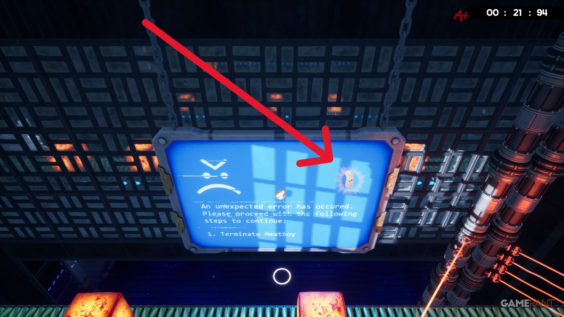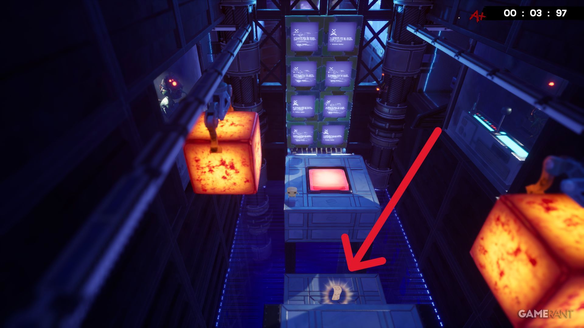 You’ll see a conveyor belt and a large blue screen. To the left of the screen are lasers that turn off briefly when hot cubes move through them. Use a cube to shield yourself and move left, past the lasers. Then, jump from the blue screen towards a Bandage, and jump back over the lasers to complete the level.