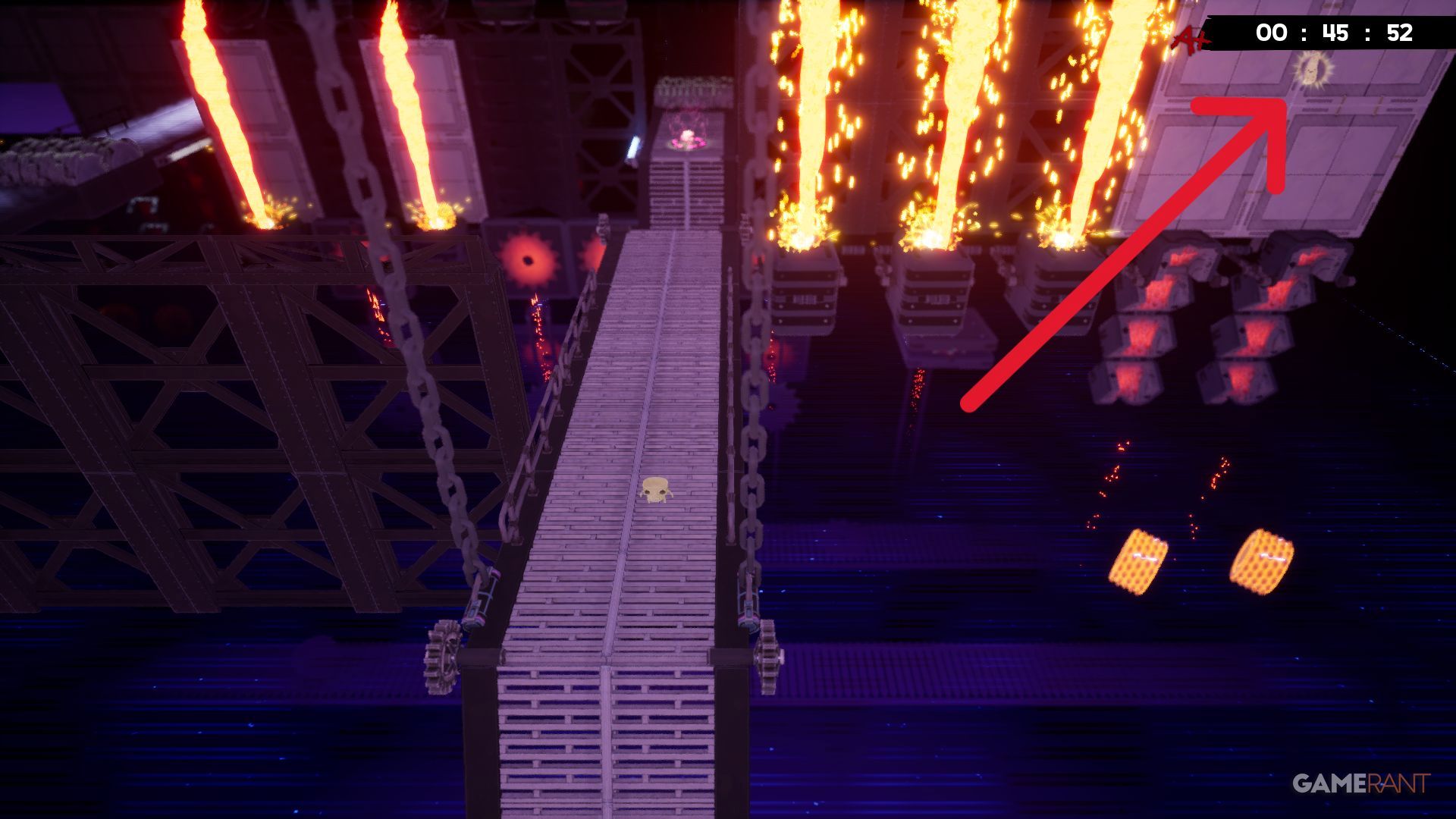 The Bandage for Burn Burn Burn in Super Meat 3D is located right after you cross the finish line – it’s easy to spot and collect. The tricky part is getting back up to officially unlock it. To do this, jump away from the tower by kicking off the wall. Then, quickly dash back and jump onto the ledge leading to the finish platform.