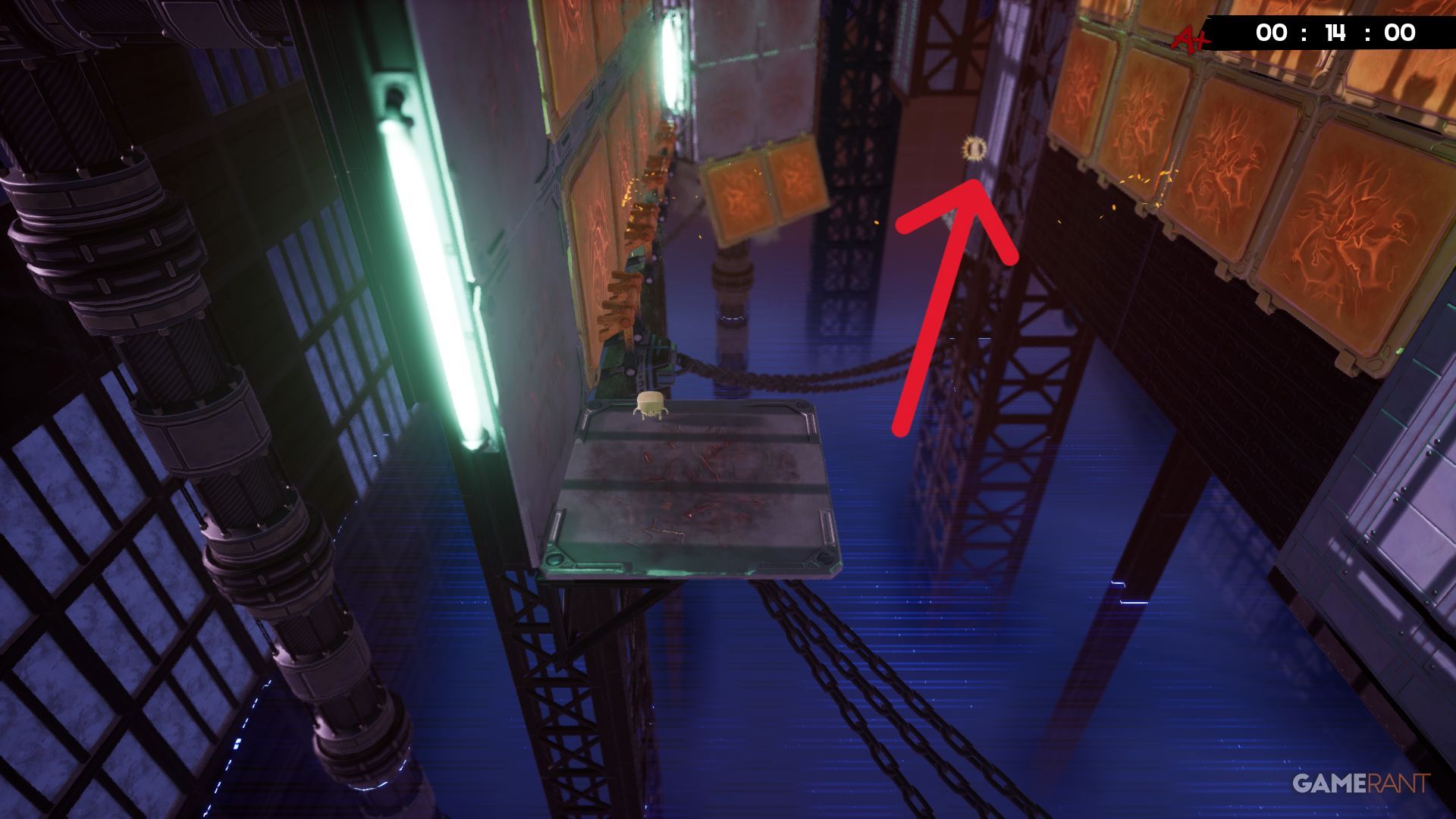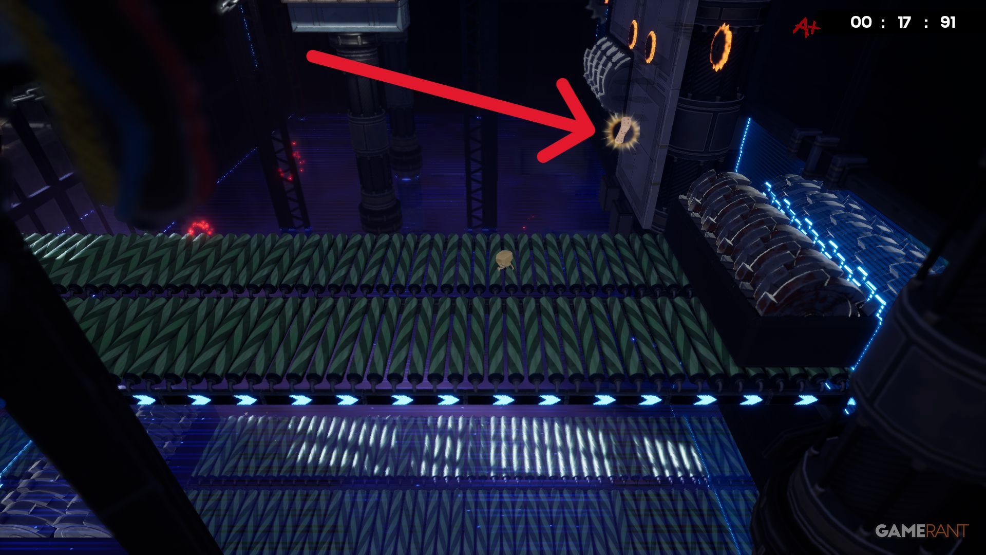 Once you pass the first conveyor belt on the Hot Blocks level, you’ll reach a safe platform. Don’t rush to the next conveyor belt on the right – instead, check to your left for the Bandage.