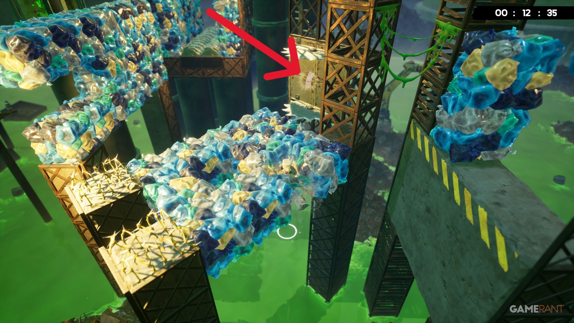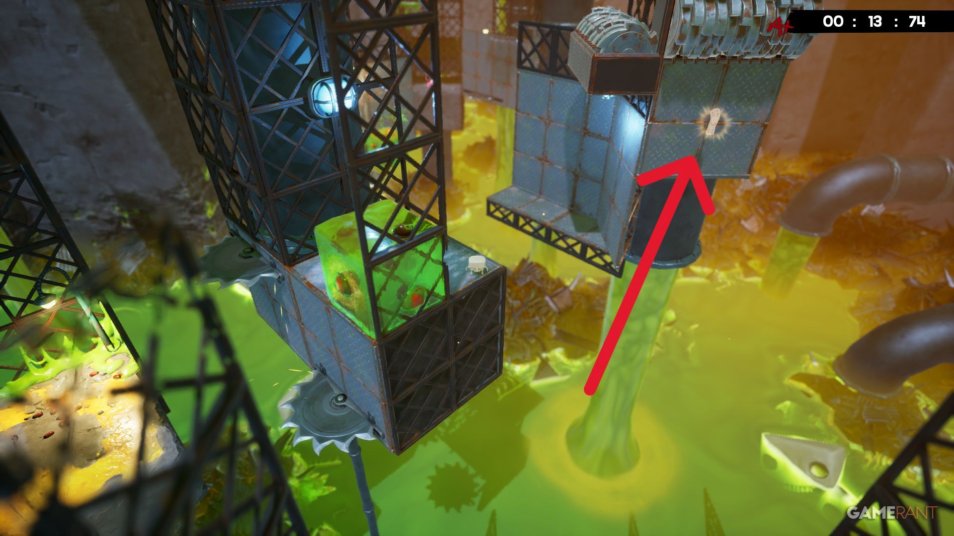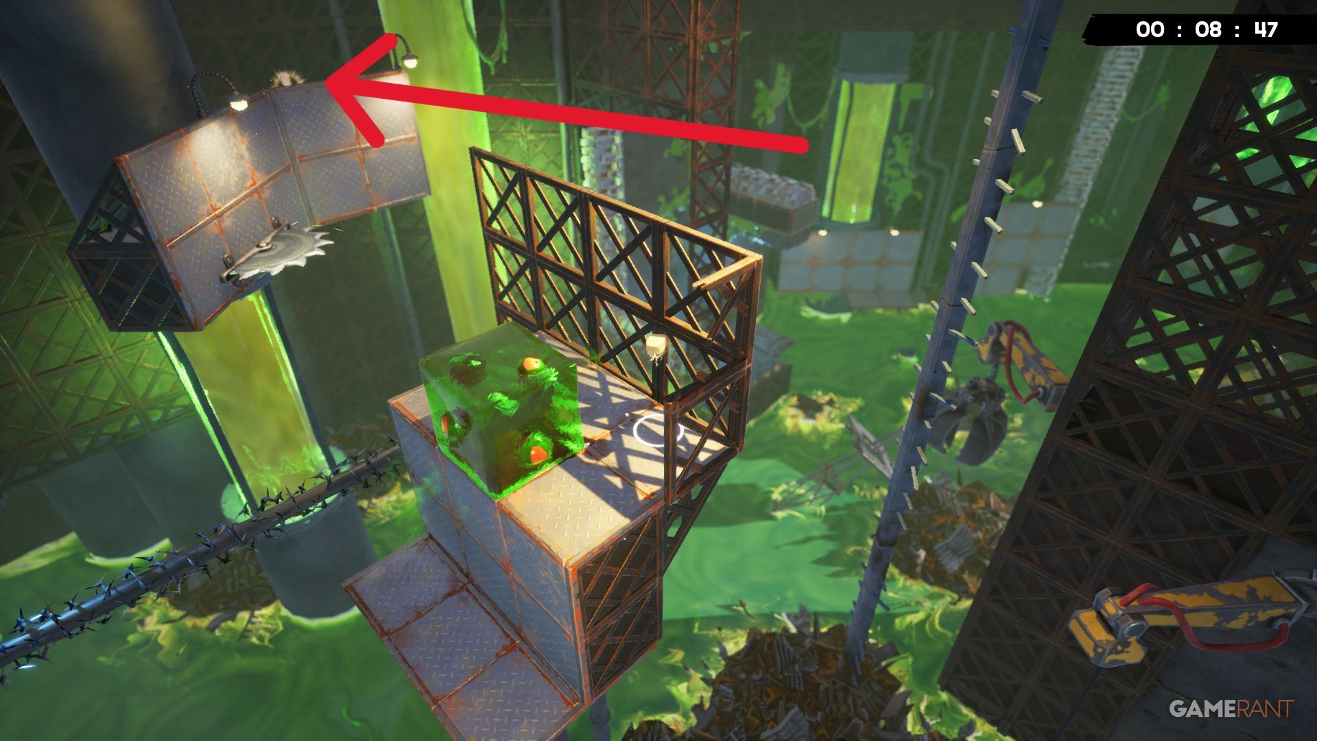 Around the middle of the Toxic Trouble level, you’ll be jumping between platforms that each have cubes slowly falling apart. The next jump is quite long, but look for a Bandage on the right side, right under a grinder, to help guide you.