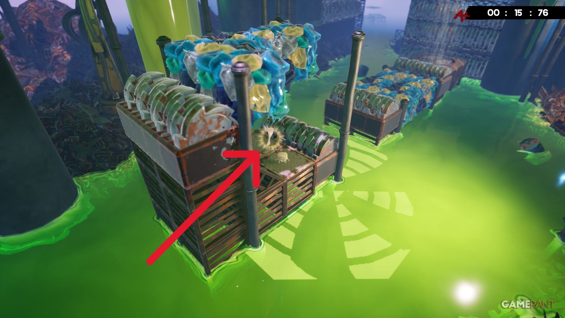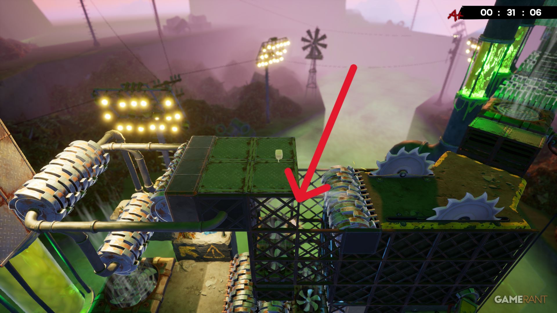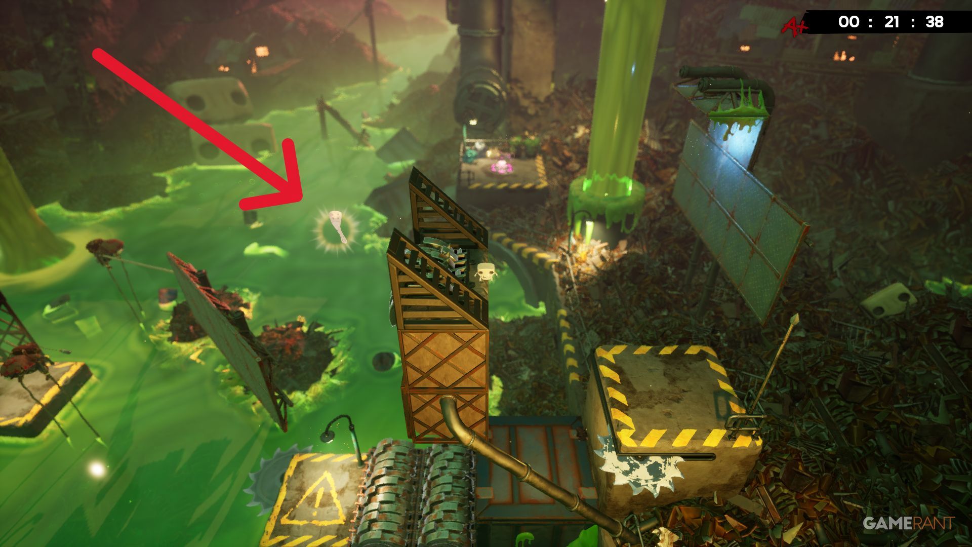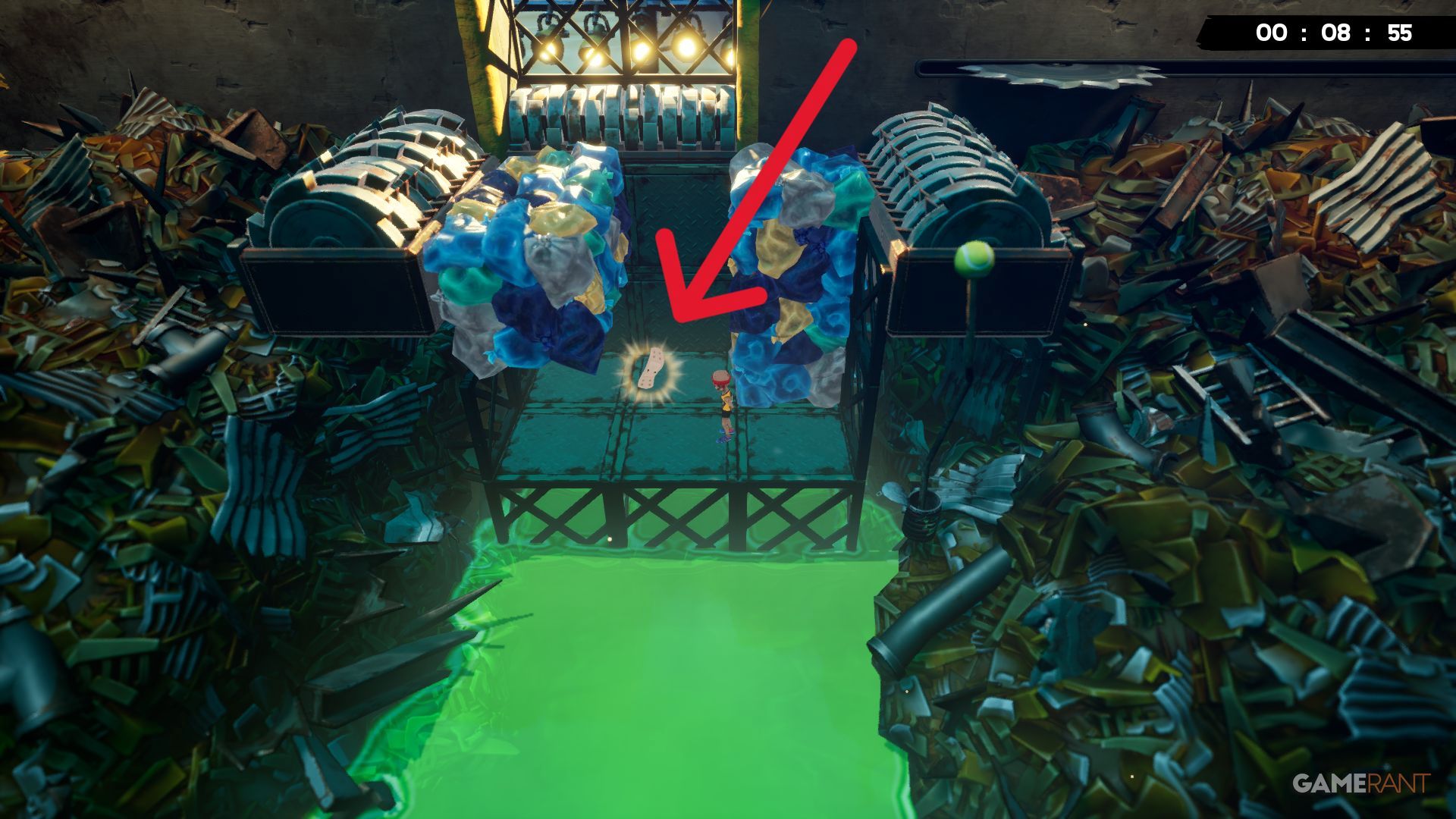 Around the middle of the Toxic Trouble level, you’ll be jumping between platforms that each have cubes slowly falling apart. The next jump is quite long, but look for a Bandage on the right side, right under a grinder, to help guide you.