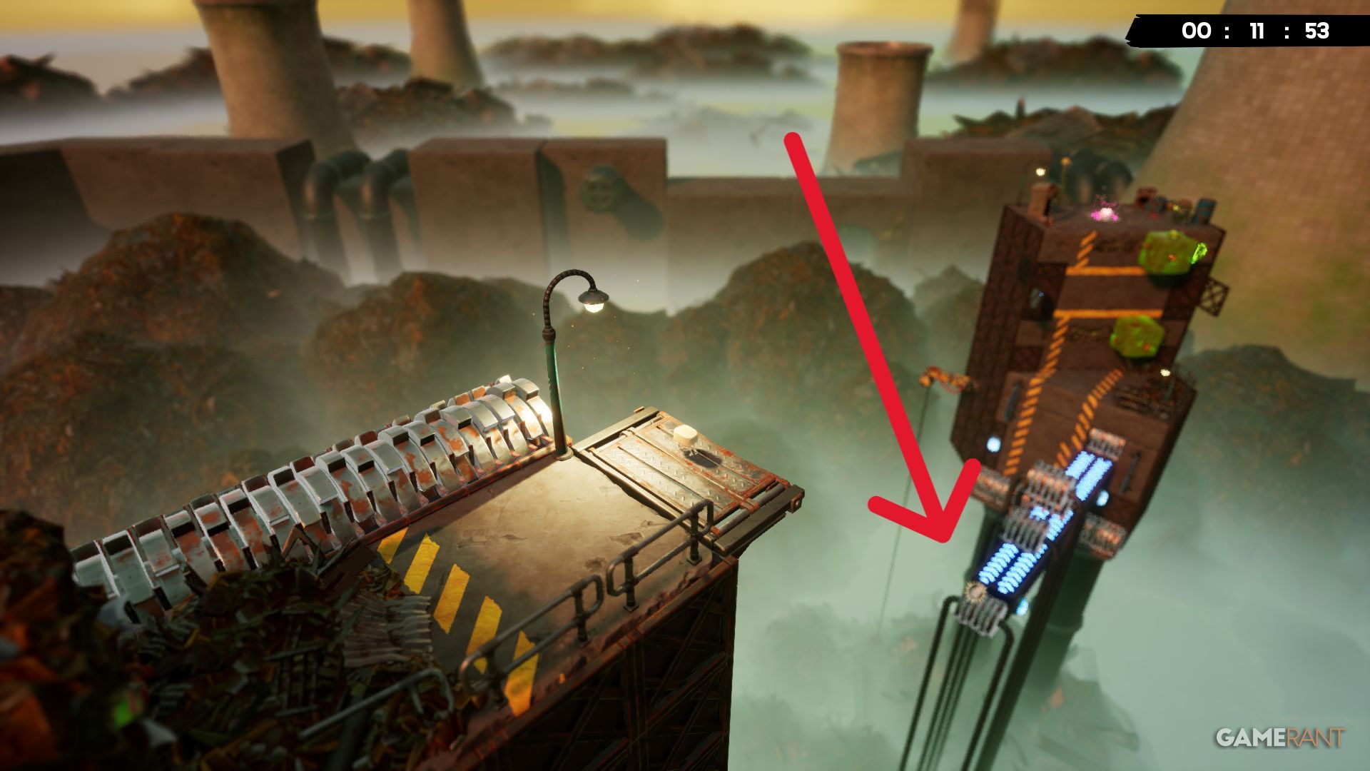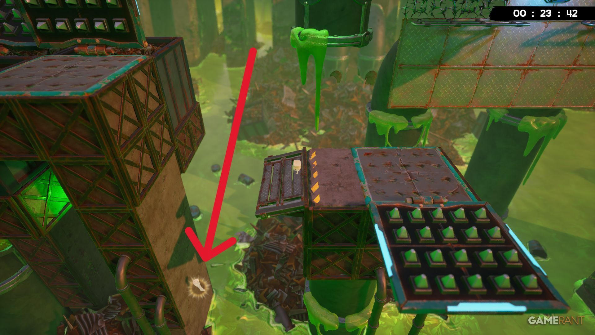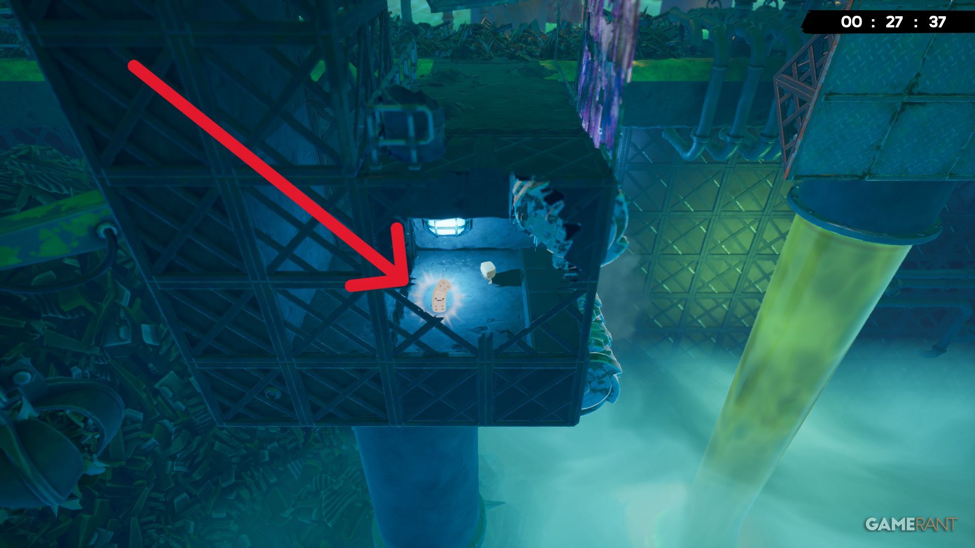 Early in the level, you’ll come across some crumbling trash between two grinders. Wait for the floor to fall apart, and you’ll find a Bandage underneath.