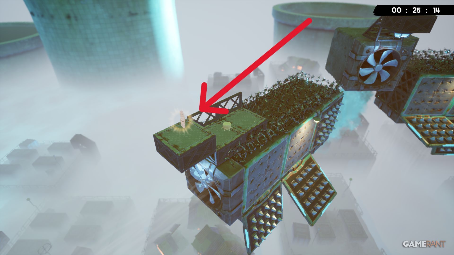 As you approach the end of the Upwind level, you’ll need to use the wind to gain height. Watch out for two grinders positioned directly above – you’ll have to bounce off the left wall to avoid them. Once you land safely, you’ll find the Bandage right below, in the center of a large metal structure.
