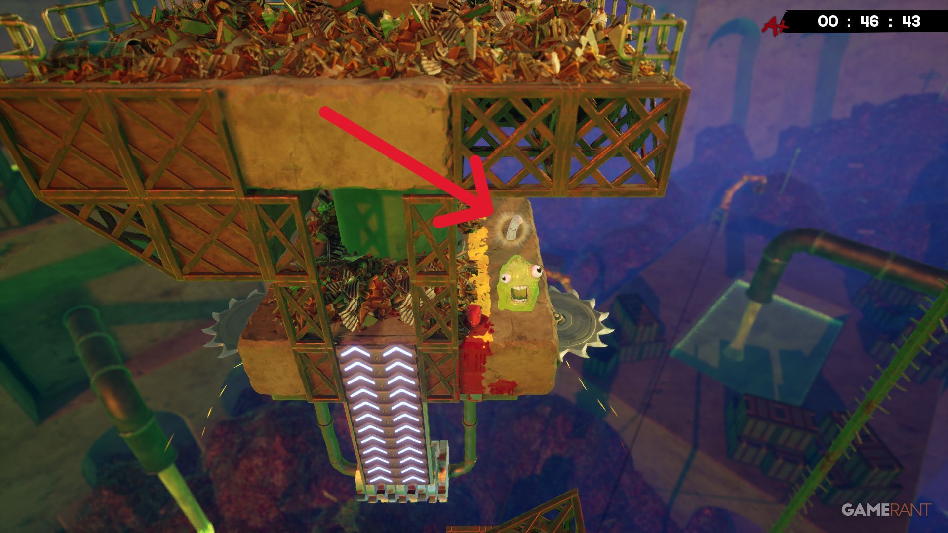 Near the end of the Toxic Trouble level, you’ll jump over two spinning grinders. A sideways-moving saw is right above them. Once you’re past the saw, the level’s finish is close, but to find the Bandage, turn around and jump upwards. Kick off the wall to reach it – it’s high above and to the left.