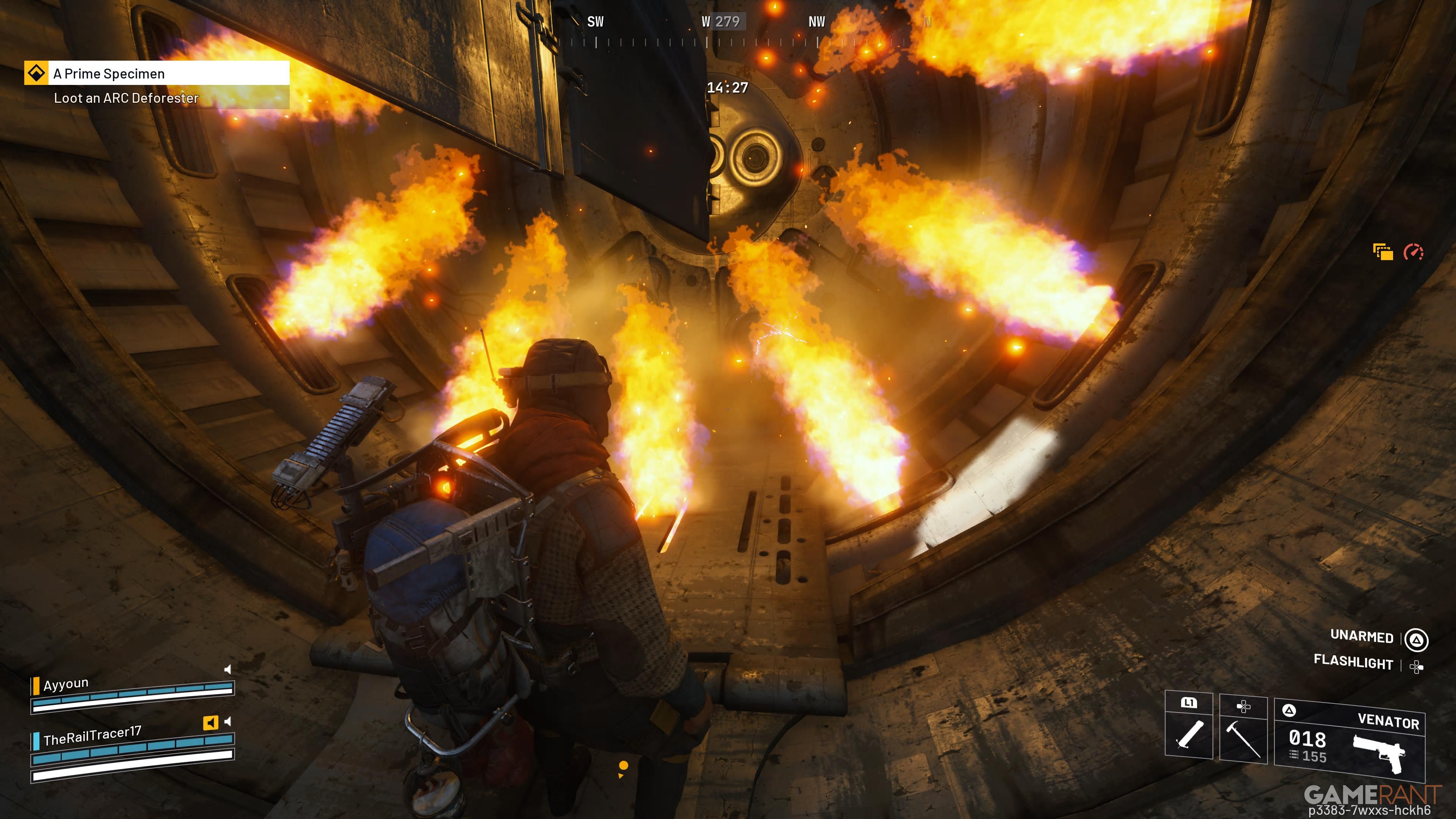 When the puzzle begins, flames will shoot out. Wait for the fire to stop before running across to press the button. You’ll need to place an ARC Power Cell into the mechanism. Then, return to the original button and climb the left wall to reach the platform above. At the end of the platform, you’ll find a container. Interacting with it will finish the quest.