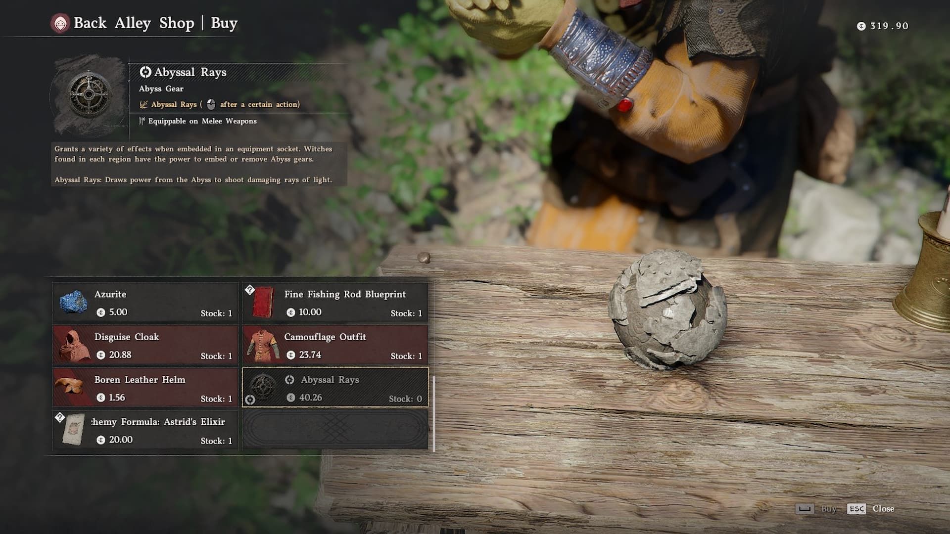 You can purchase Abyssal Rays from a vendor located southeast of Demeniss City. Look for a small shop in a back alley, near the rocks where the city wall curves. If you’re coming from the east, the vendor is just to the left of the city gate. Check the map above to find a nearby Abyss Nexus, which will help you pinpoint the location.
