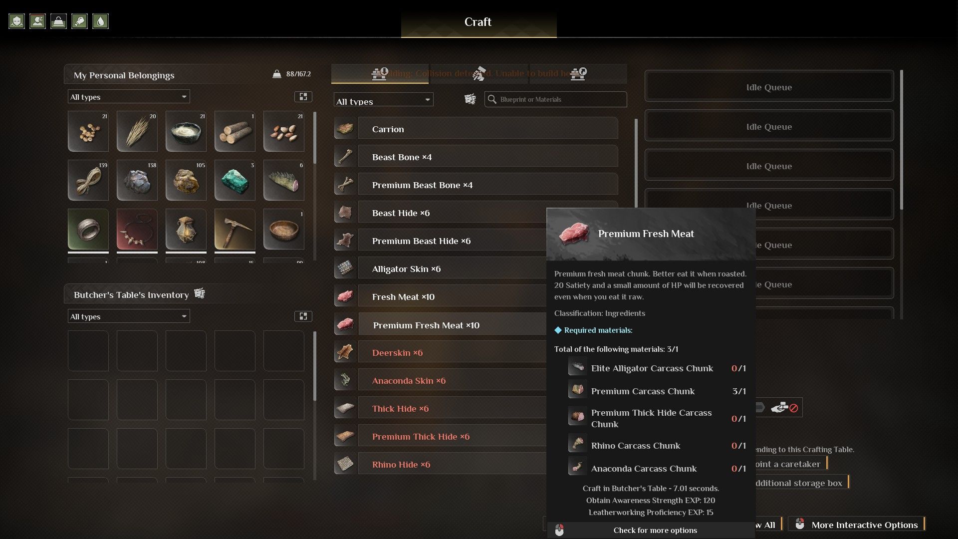 Occasionally, animals will directly give you high-quality meat when you skin them. However, it’s more efficient to use a Butcher’s Table to break down everything into valuable resources. You’ll need a lot of materials as you progress, so make sure to utilize everything you get.