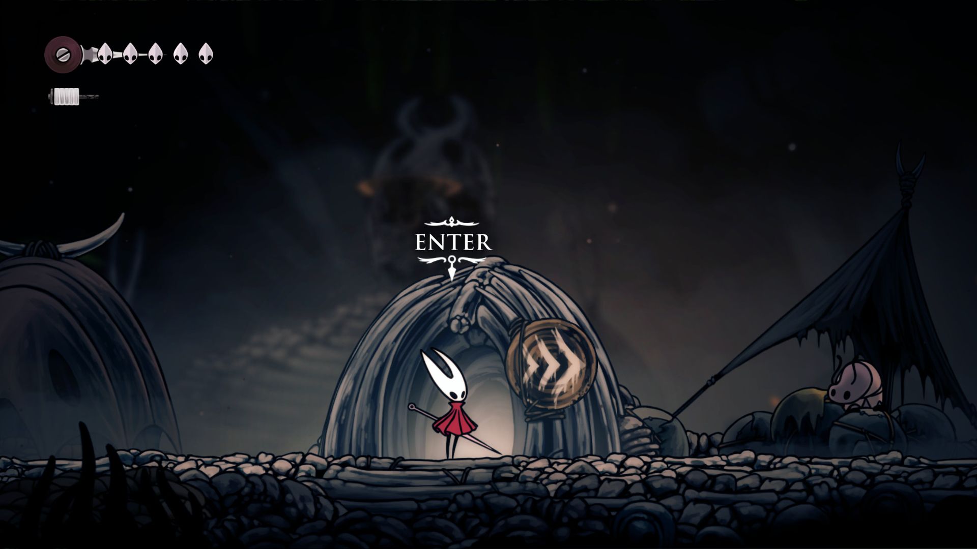 Upon encountering Sherma, you should head back to the left, ascend slightly, and then turn right. This path will lead you to the rear side of the Bone Gate. However, be prepared as you’ll need to navigate through a room filled with waves of enemies. Among these adversaries, there’s a big crawler that can inflict two masks worth of damage with each attack.