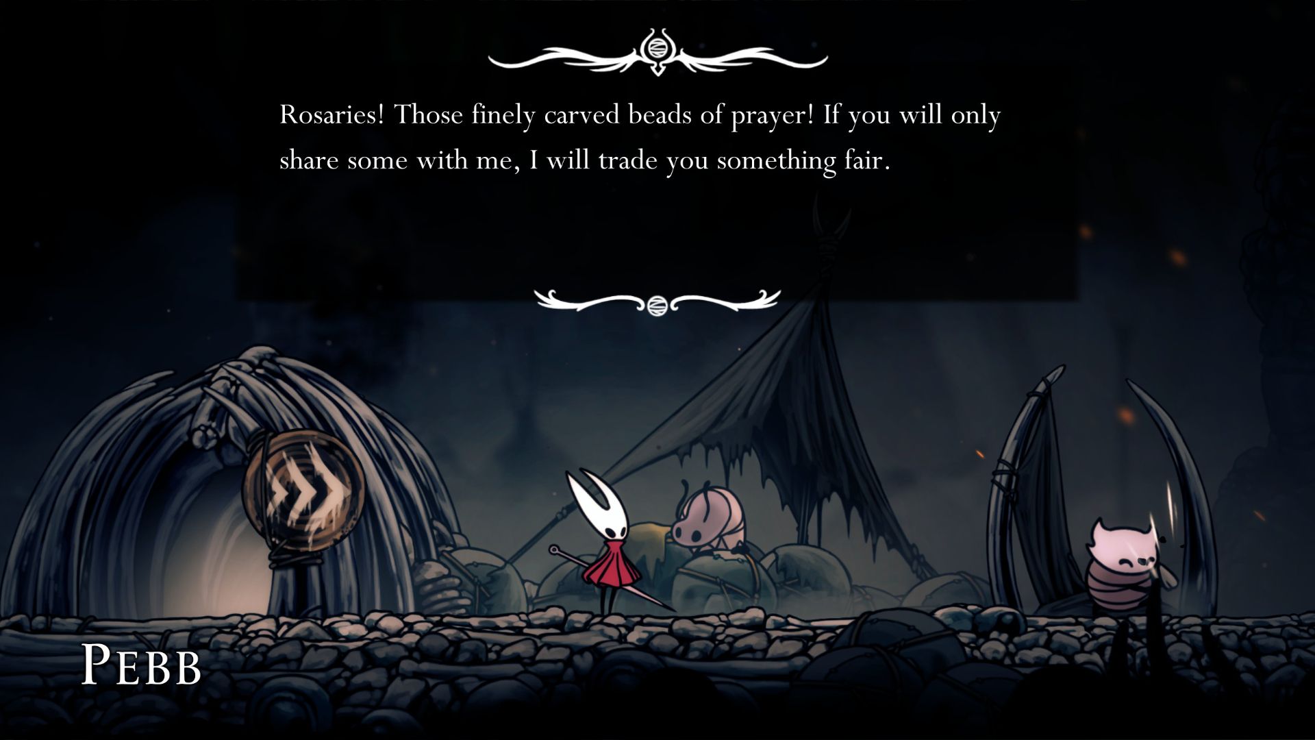 - Pebb is the town merchant and will offer a variety of general goods, like a Simple Key, Mask Shard, and the ability to string up your Rosaries. Though you likely don’t have any Rosaries when you first meet him, you’ll collect and spend this currency with merchants like Pebb.