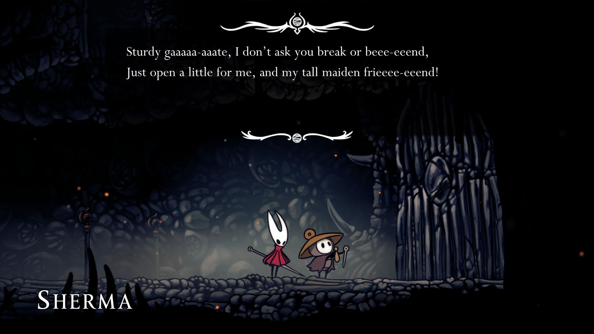In the course of your journey through Pharloom, you’ll frequently encounter Sherma, a pilgrim adorned with a broad-brimmed hat. She uses music and song as a means to navigate challenges, including a formidable Bone Gate.