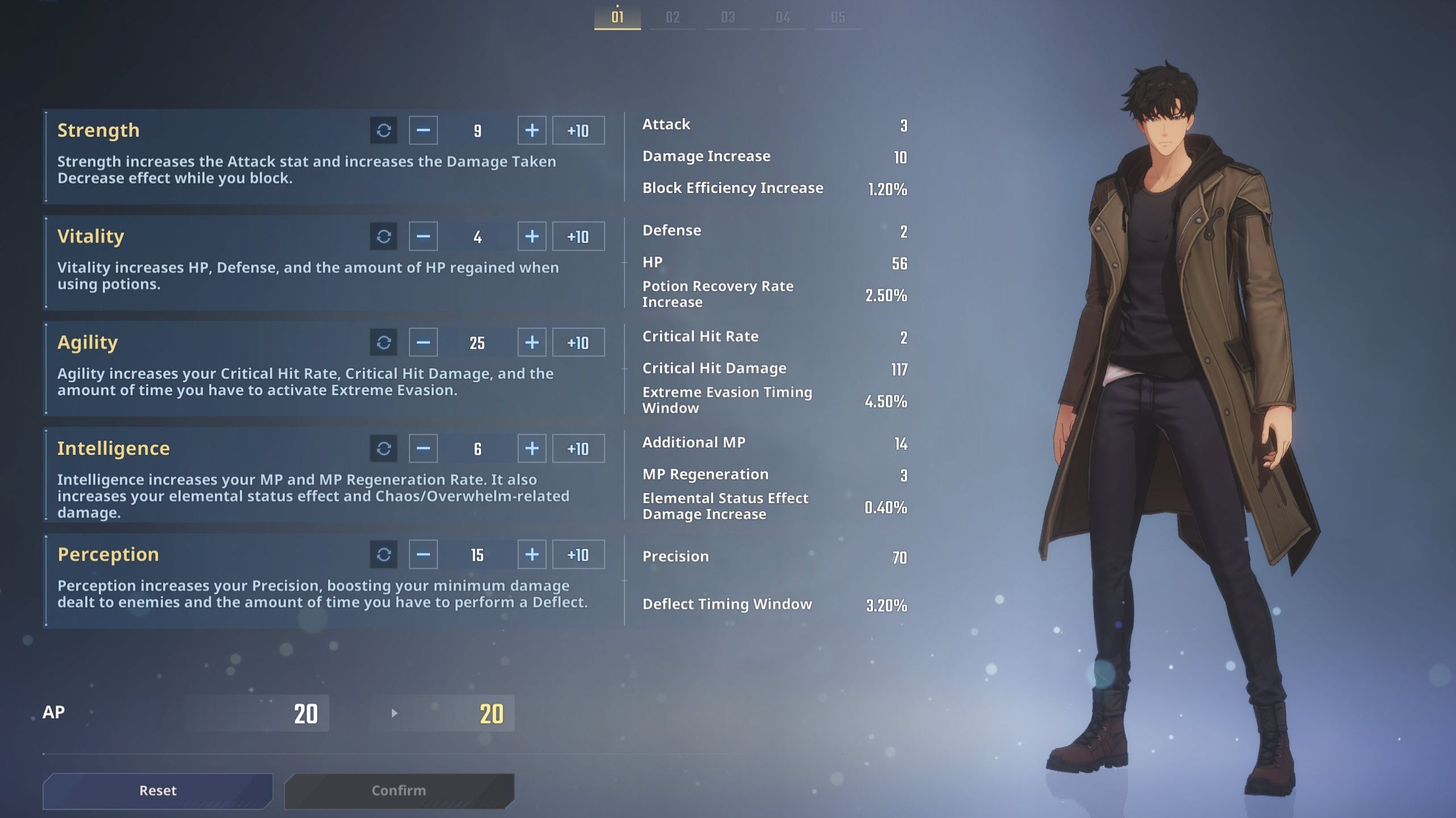 - Intelligence: Increases your MP, MP recovery rate, elemental status effect, and Chaos/Overwhelm-related damage.