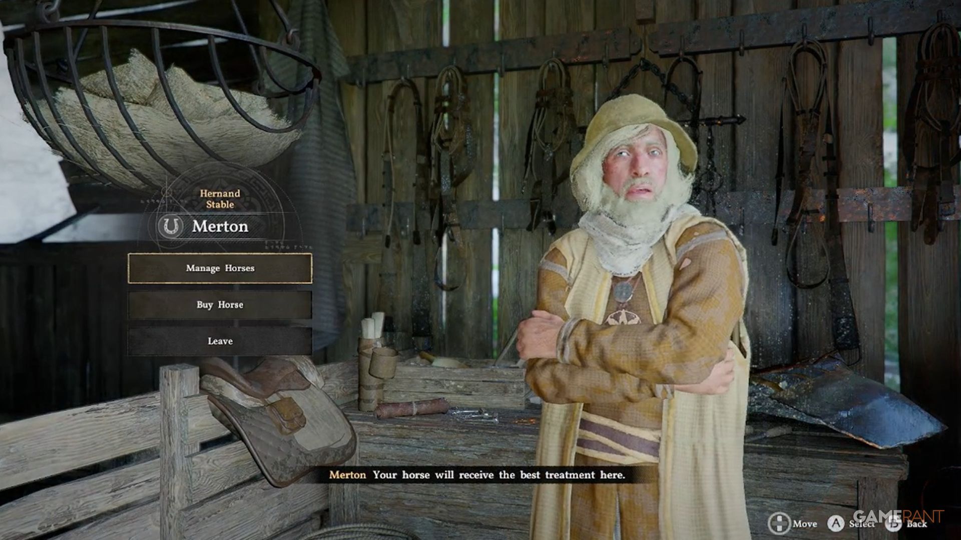 Talk to the character with the horseshoe symbol to purchase and care for horses. Once you’ve done that, your horse will automatically be fully healed. In Hernand, the stable master’s name is Merton!