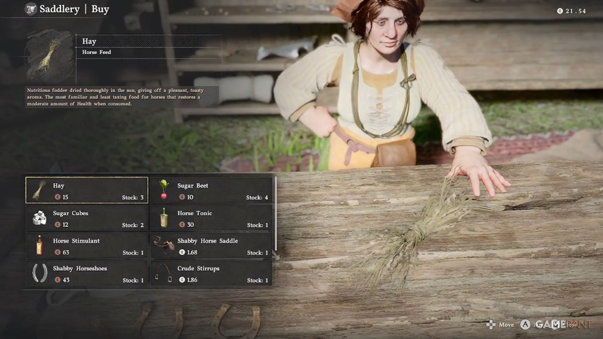 You can buy horse food – like hay, sugar cubes, and sugar beets – from the local saddlery in this area. After you buy some, add it to your inventory and then place it in front of your horse to let it eat. Be aware that other nearby horses might try to steal the food!